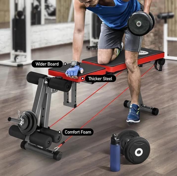 Burn fat, build muscles and stay motivated with Genki Black and Red Adjustable Weight Bench FID Fitness Bench! The weight bench set is made from high-quality steel with a powder coating, which makes it solid and sturdy to support up to 150kg. Owing to its soft foam cushioning and durable PU leather cover, the gym bench is comfortable for use and stable to serve for years. This workout bench features multiple position modes – flat/incline/decline for you depending on your needs. The foam-covered handgrips are included for added comfort during leg raises and elastic ropes can be used for stretching. Easy to assemble and clean, this adjustable weight bench is perfect for home workout or backyard gym.