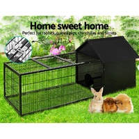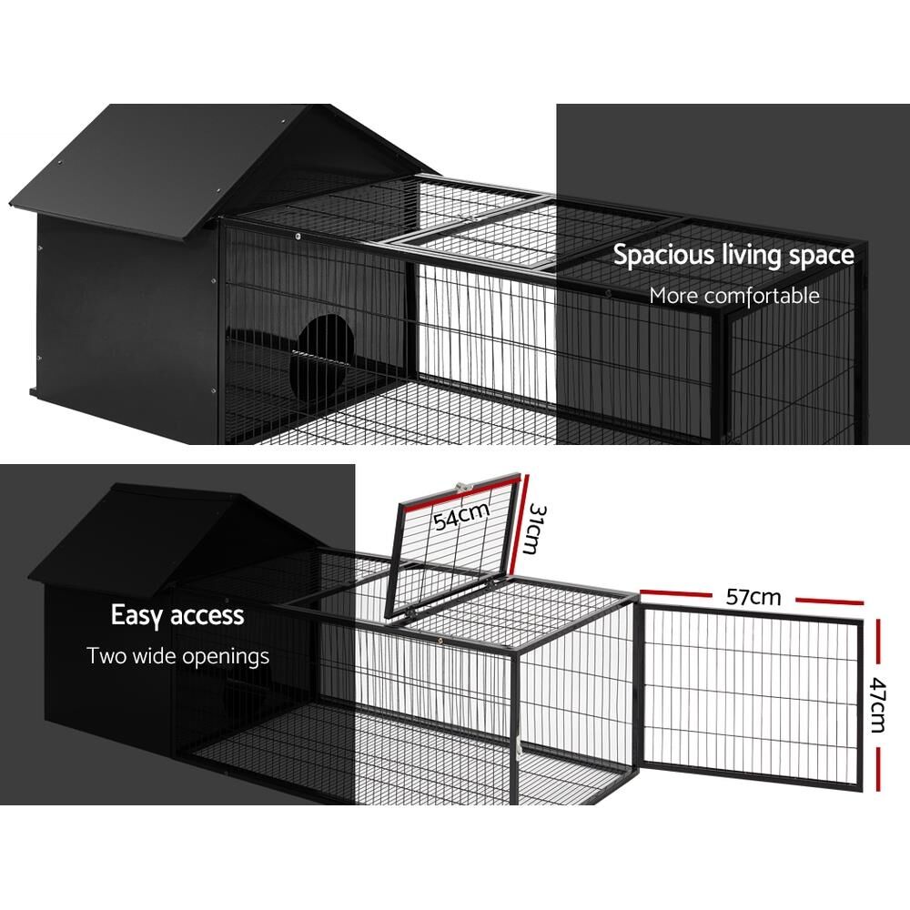 Attached securely to this shelter is a long, weather-roof metal cage that lets your precious ones stretched their legs, have a nibble at the grass or enjoying some fine fresh air and sunshine. The metal cage has lockable openings at the top and front to get your pets in and out in a jiffy or to feed them. Not least, the chew-proof metal frame ensures no easy escape for your pets or unwelcomed break-ins by predators.