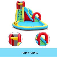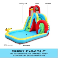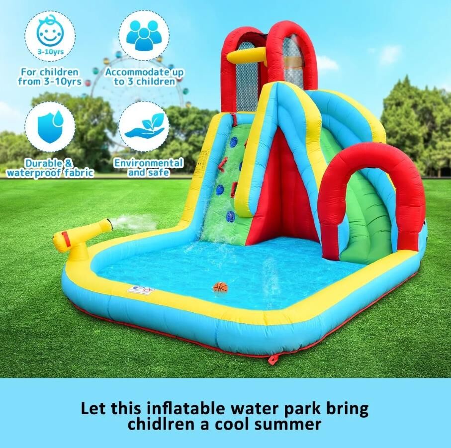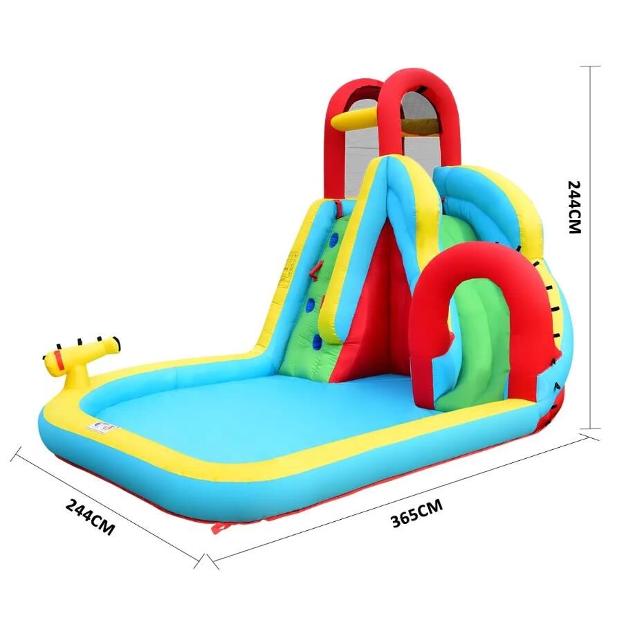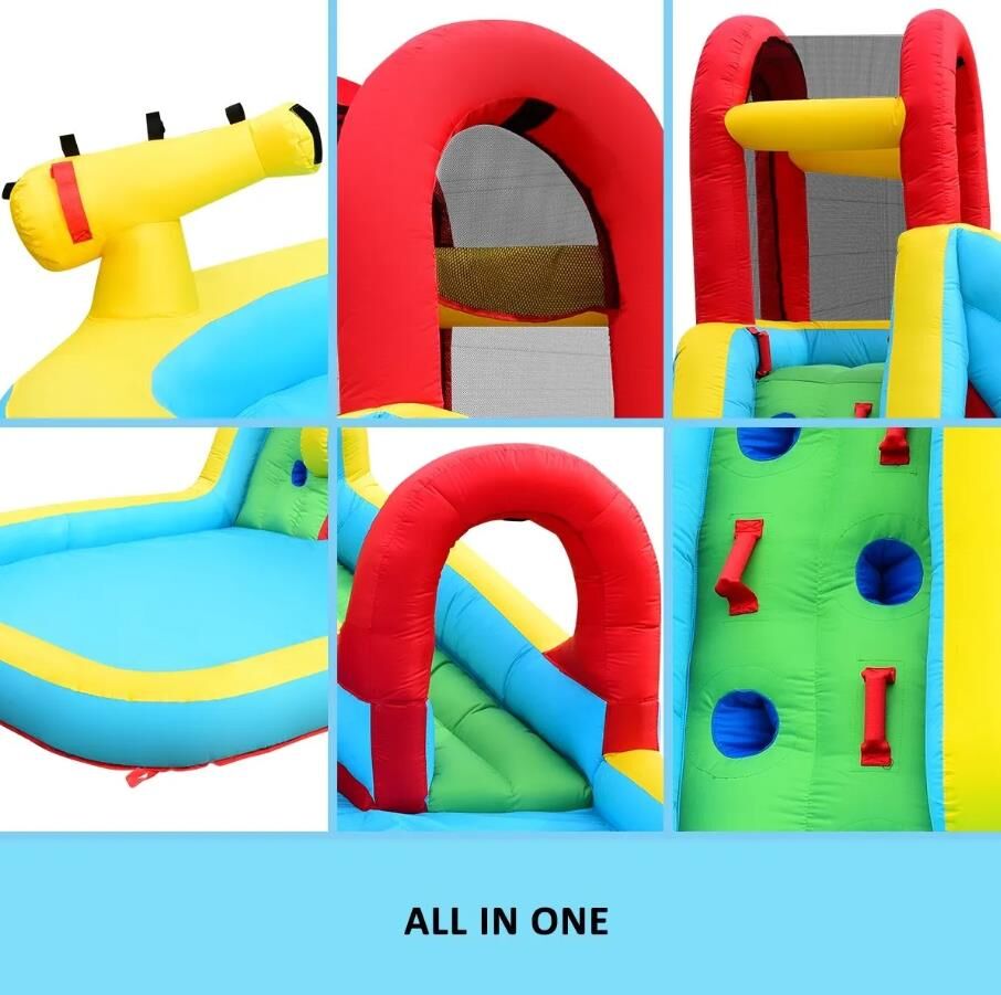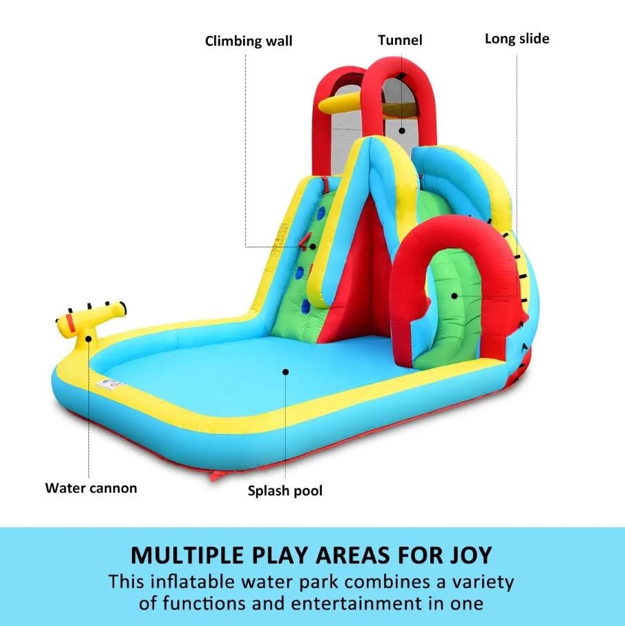 Ensure the ultimate safety of your kids when they enjoy the cool summer with this All in One Inflatable Water Park Water Slide Bouncer House. The inflatable bouncer comes completed with a jump castle, a huge blow up pool, an inflatable water slide with a tunnel, a climbing wall and a cannon, creating a variety of entertainment for children. This bouncer park is made of heavy-duty and wear-resistant oxford material, which offers durability and easy cleaning. Available in brilliant colours and attractive design, the toy set is also convenient to set up and deflate. Easy to store and transport, the blow-up water park can be placed on a park, yard, lawn or garden.
