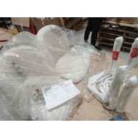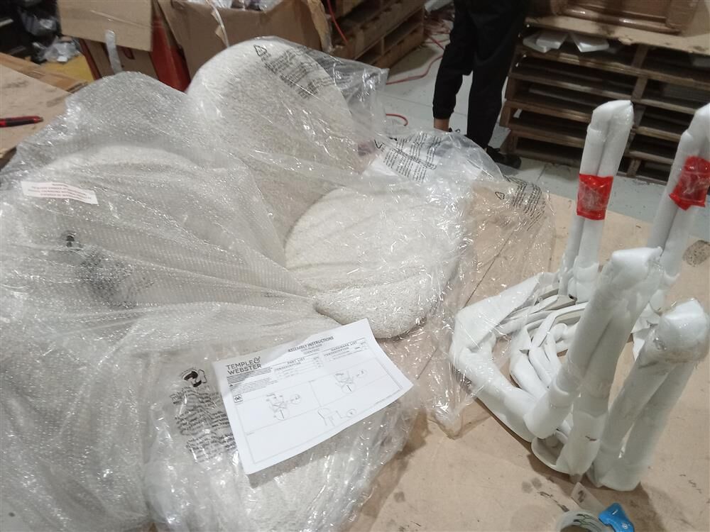 - Materials: plywood frame, powder-coated iron legs, polyester bouclé upholstery, high-density foam padding