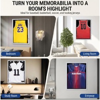 Frame your favourite sports jerseys securely with this Wall Mounted Jersey Shadow Box Display Case. Expertly crafted from durable wood with a fade-resistant matte white finish, our jersey display frame combines elegance with longevity. Besides, the shatterproof acrylic panel offers UV protection to ensure your cherished items remain vibrant over time. Featuring a large size, it accommodates jerseys from baseball, basketball, football, soccer, and hockey while also serving as a shadow box for military uniforms, graduation mementoes, and more. Thanks to a velvet-like felt lining and gold-plated anti-theft locks, it provides extra security for your valuable collectables. Enjoy three display options, including a wooden hanger for sleeveless jerseys, a metal hanger for smaller items, and a pin board for wrinkle-free presentation. Pre-assembled and easy to mount, the sports jersey frame is perfect for homes, offices, or sports-themed spaces.