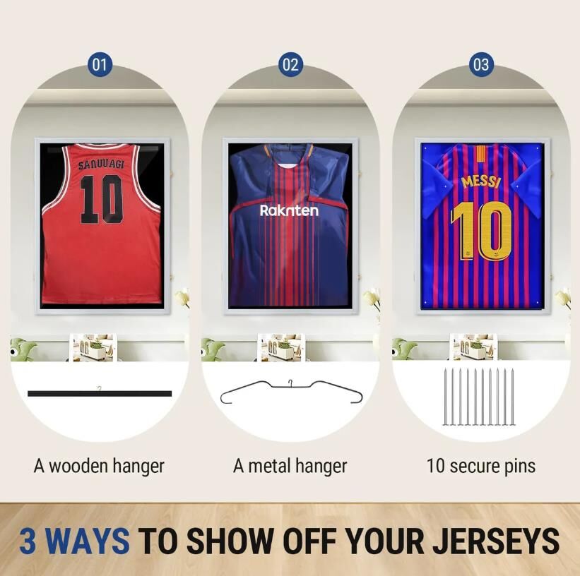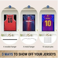- Three Display Options: Display jerseys using a wood hanger (sleeveless), metal hanger (smaller sizes), or pinboard (long-sleeved) for a clean, wrinkle-free look.