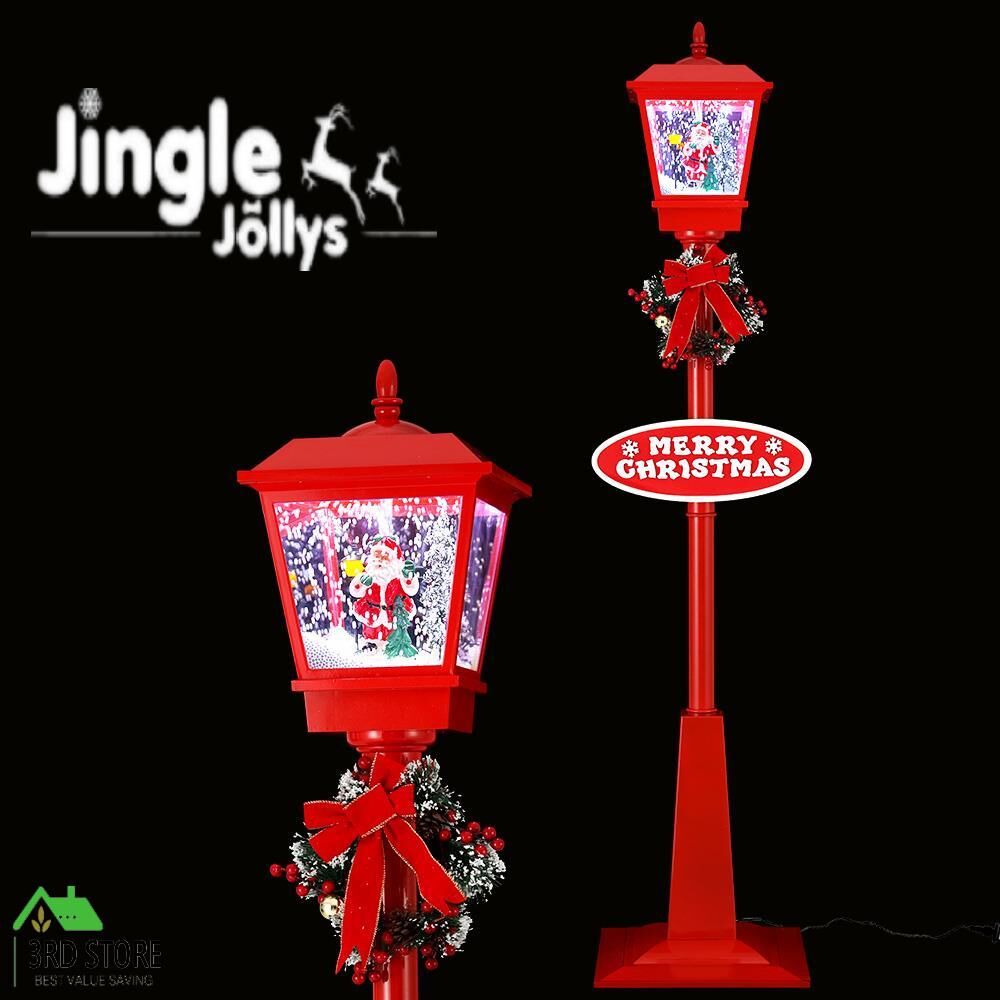 Share the spirit of Christmas with a classic style street lamp light from Jingle Jollys. Our 1.8m tall red Christmas lamp features a decorative Santa, tree and cascading snowfall inside, illuminated by 18 energy saving LED lights. Besides adding a touch of variety to your display, the cheerful lamp also plays music for a seasonal, cheerful atmosphere. A colourful bow, wreath and Merry Christmas sign tie this unique d�cor together. The 3.5m long power cable enables greater flexibility for installation, and the whole piece is easy to assemble. For use outdoors or indoors, our Christmas lamp creates the perfect ambience throughout the season of peace and goodwill.