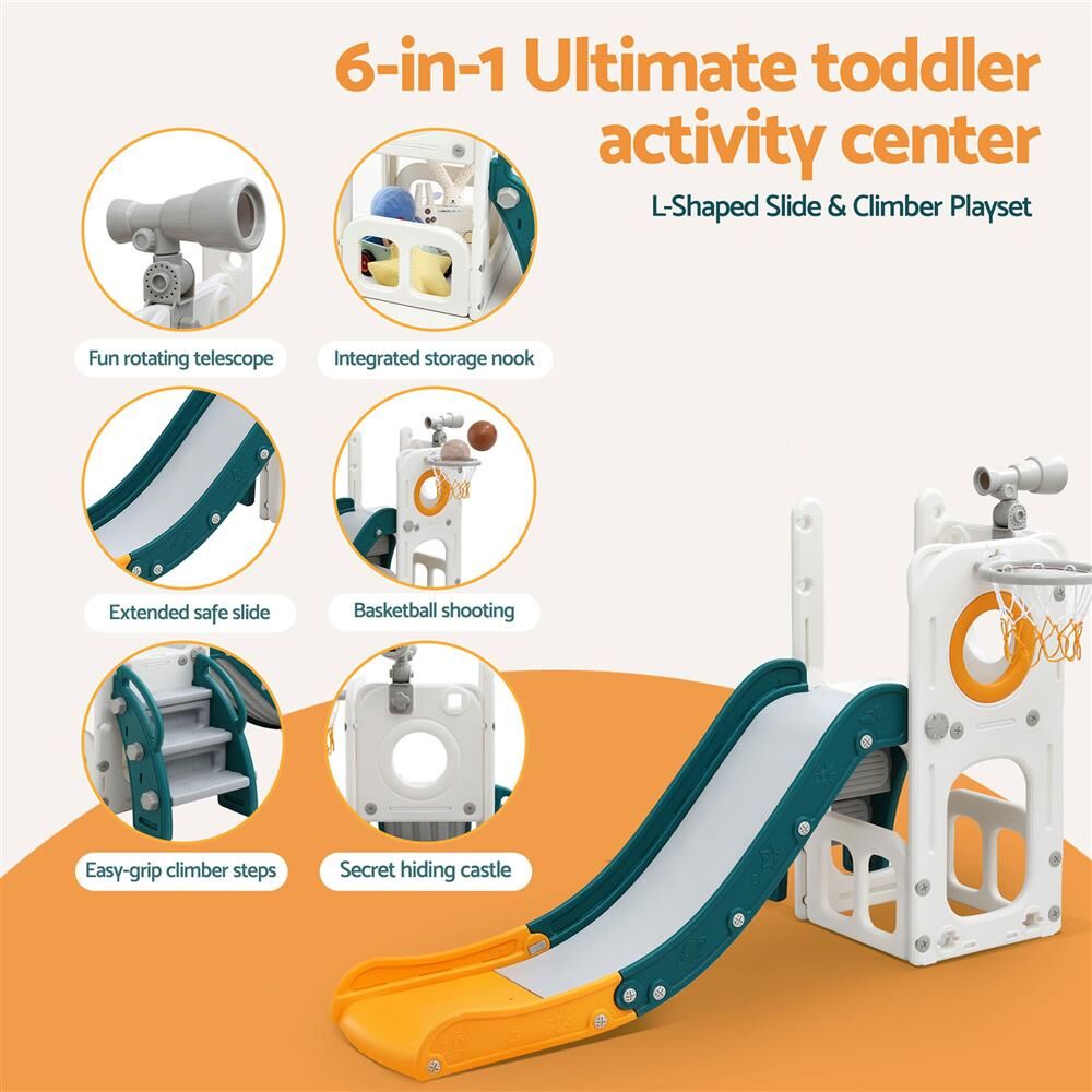 This multi-activity play structure offers endless fun for your little one, expertly designed to promote active play while prioritizing safety. The center includes a fun telescope for imaginative exploration, a climber, a thrilling slide, an engaging basketball hoop, a secret hiding spot, and built-in storage for easy tidy-up. The slide is engineered for maximum safety, featuring a dedicated acceleration zone, a deceleration zone, and a gentle glide buffer area for a safe and comfortable experience. Climbing is secure thanks to enclosed steps equipped with non-slip surfaces and easy-grip handrails to prevent accidental slipping. Stability is paramount, ensured by a robust triangle-shaped structure that keeps the entire unit steady during play. Furthermore, the waiting area is safe and secure, measuring a generous 39 cm wide with round edges. This activity center is ideal for helping your children develop crucial physical, motor, and social skills through engaging, active fun.