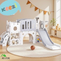 Keep your kids active and entertained with the Keezi 3-in-1 play set. It includes a wide platform, fun telescope, and dual ladder for endless fun. Built from premium HDPE in stylish grey and white, it features anti-slip steps, safe grip handles, and ample bottom space for toy storage. One ball and ring are included for added play. Easy to assemble and ideal for indoor or outdoor use. Note: Kids should be supervised by adults when using the swing.