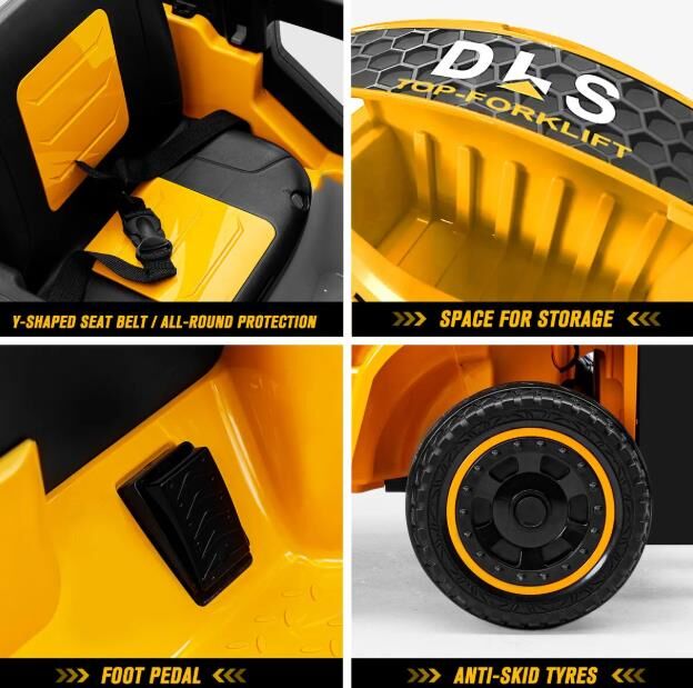 - Multi-functional MP3 Player: The kids’ forklift has a cool stereo system that you can plug into a USB device to play the kid’s favourite tunes