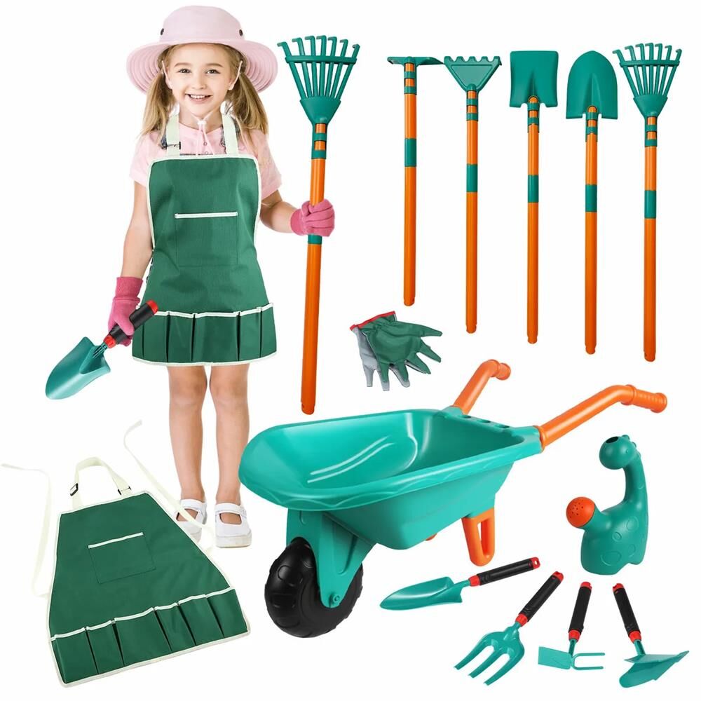 - Kids Gardening Set: Includes 1 kid’s wheelbarrow, 5 long-handle gardening tools (hoe, leaf rake, pointed shovel, five-tooth harrow, and flat-head shovel), 4 small handle tools (hand trowel, hand plough, cultivator hand rake, and double hand hoe), 1 watering can, 1 pair of gardening gloves, and 1 apron with pockets. Perfect for all gardening needs.
