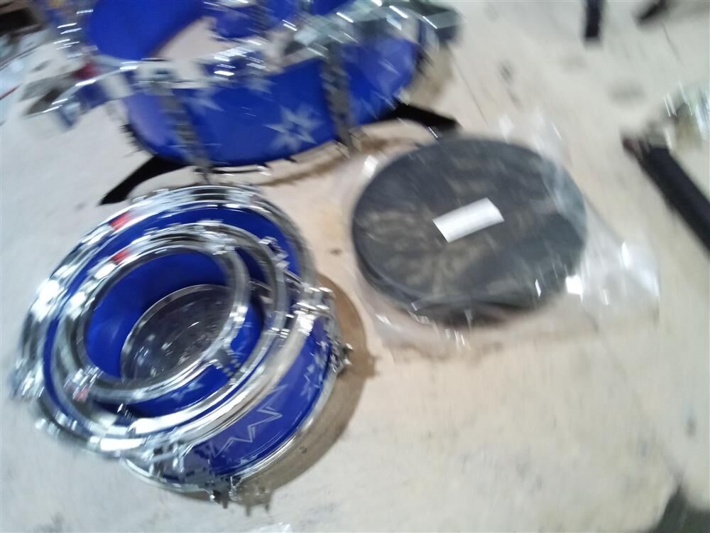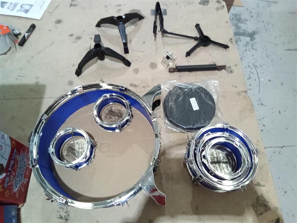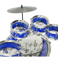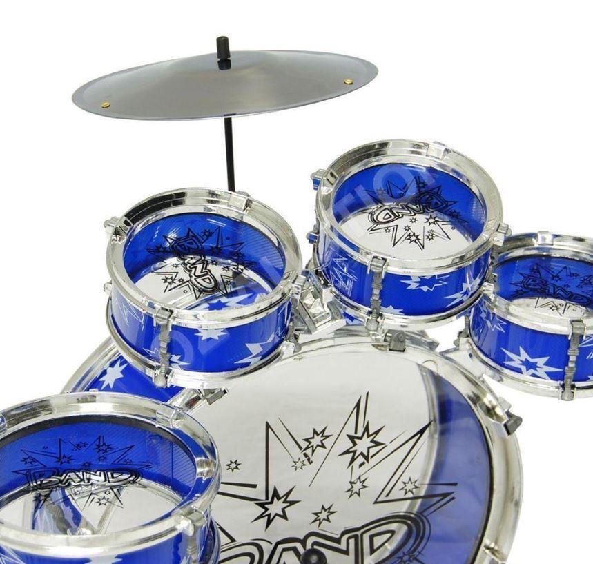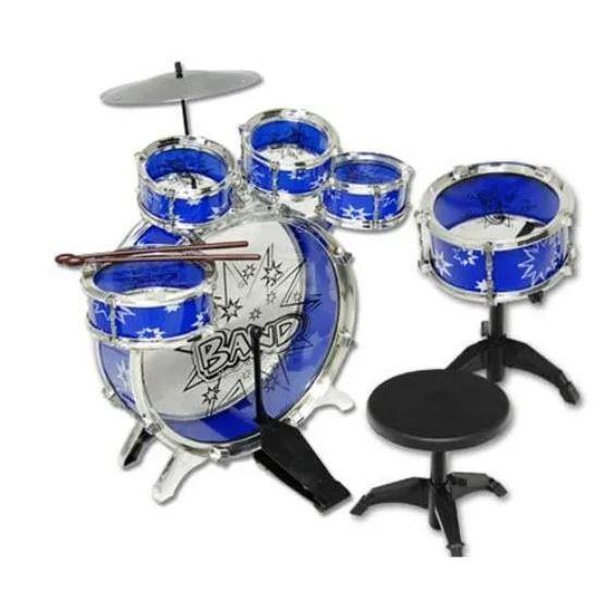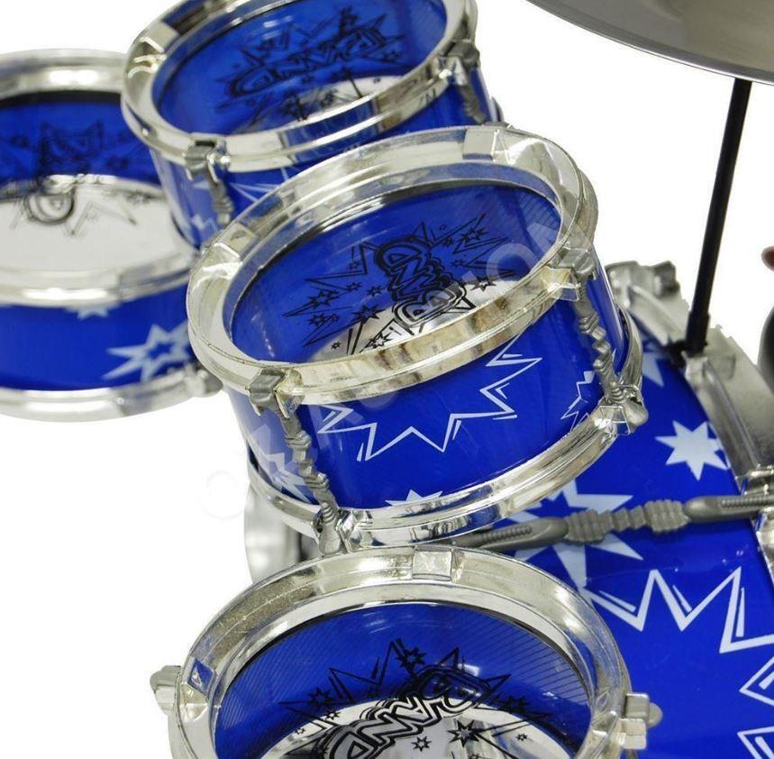 Have an aspiring musician in the house? Want to discover your child's musical talents? Get ready to be the next rock star! This unbeatable 13 pieces Jazz Drum Play Set sure will impress your little superstars. Easy to assemble by adults, it's sure to provide hours of fun. This drums set comes with a bass drum, small tom tom, large tom tom, mini tom tom, cymbal and stools. All the drums are in a bright blue color with chrome plastic shinning edges. A foot pedal is also included for the bass drum.