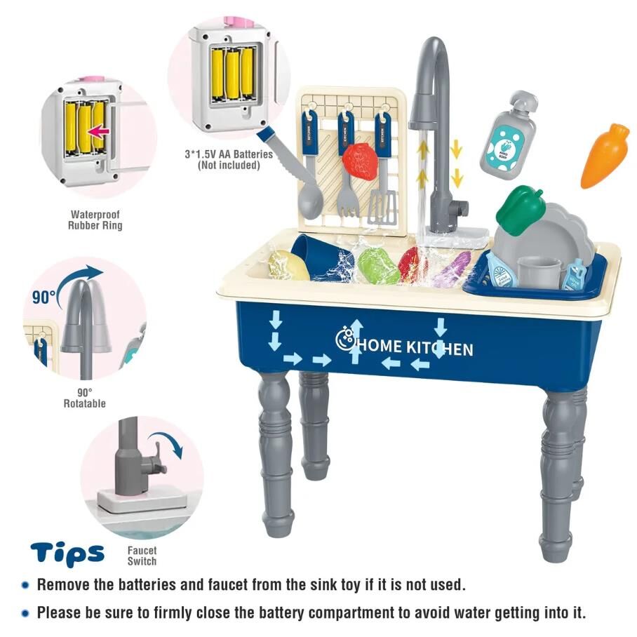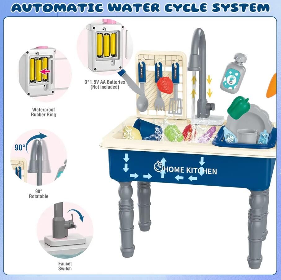 - Automatic Water Circulation System: The sink toy comes with an upgraded realistic faucet and an automatic water circulation system. The sink can pump water automatically, so you do not need to press the water pump every time. Just fill the base of the sink with water and turn on the faucet to flow the water.