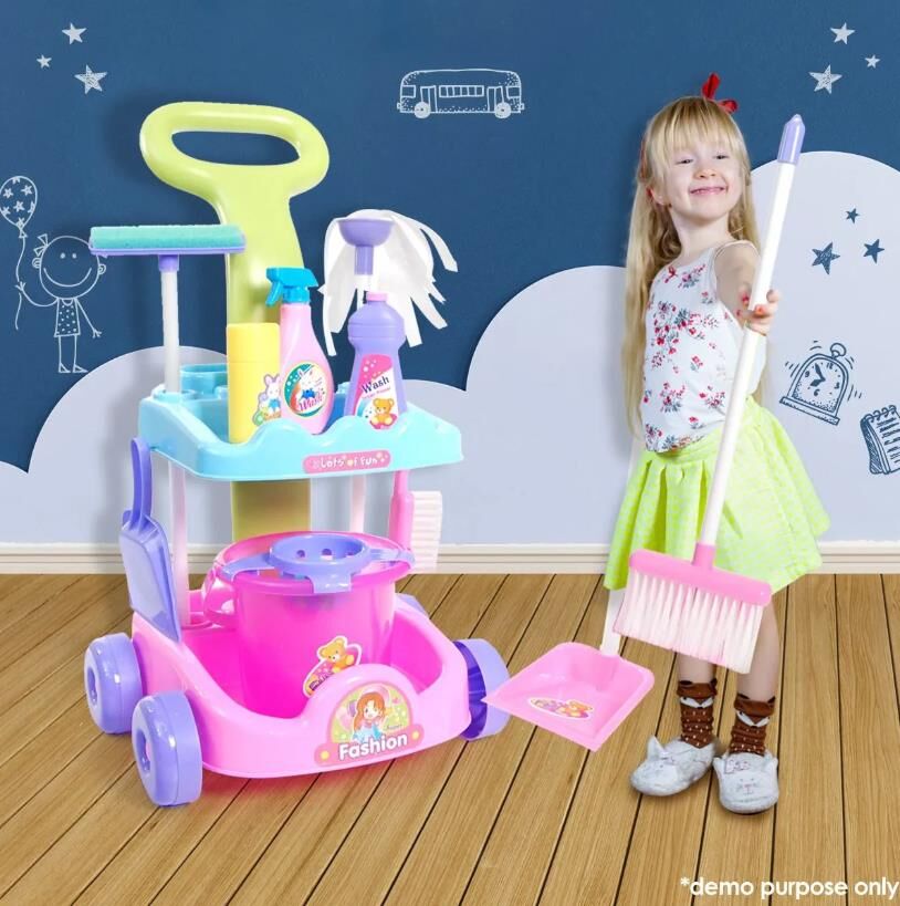 Kids Pretend Play Toy Cleaner Cleaning Trolley Set Broom Mop Bucket Tools Duster