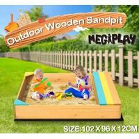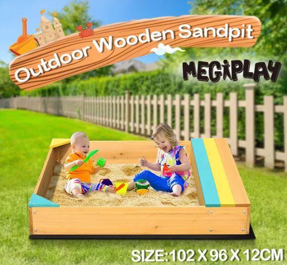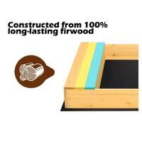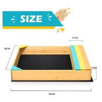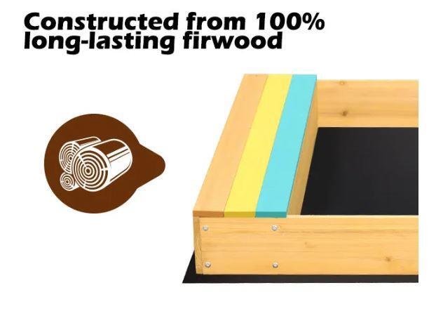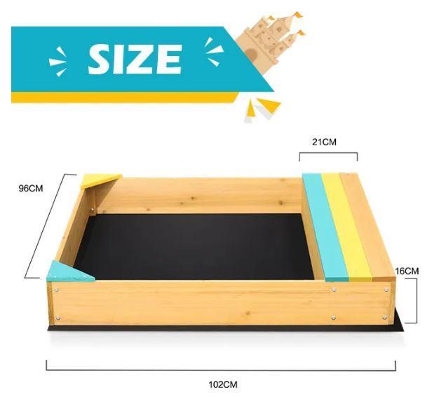 Enrich kids' playing time and cultivate their practical ability with this colourful sand pit. Constructed in quality wood, this perfect sandbox is robust and long lasting in your backyard or garden. Furnished treated timber, this sandpit will be against wood rot and insect damage. The eco-friendly material will leave you the peaceful mind that the outdoor play equipment is non-toxic and safe for you and your kids enjoying for hours and hours. The ground sheet is included to allow you to place the entire assembly on it and keep dirt, bugs, ground moisture from interfering with the sand. The waterproof and UV-resistant cover will protect the kids sandpit from sun and rain when not in use. Feel free to bring great outdoor pleasure for your kids to share with their fellows in this hot summer.
