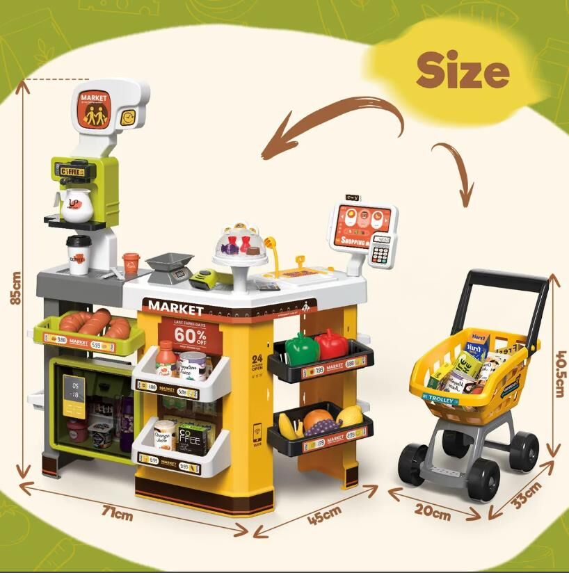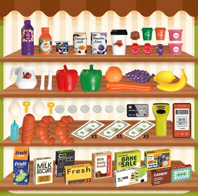 Bring the supermarket experience home with our kids pretend play shop grocery supermarket playset. Mimics real-world scenarios, this 65-piece toy set is ideal for sparking imagination and interactive play and learning the basics of shopping, money handling and social interaction. With a shopping cart, cash register, scanner, POS machine and fruit and veg toys, this grocery store playset promises hours of entertainment. What’s more, it integrates light and sound functions, adding a dynamic dimension to the shopping experience and keeping your child entertained and captivated. Take the opportunity to enjoy your free time while children are completely absorbed in their imaginative grocery store play. The kids role play set has passed EN71 safety tests and is BPA-free, non-toxic, and safe for enjoyable pretend play sessions.