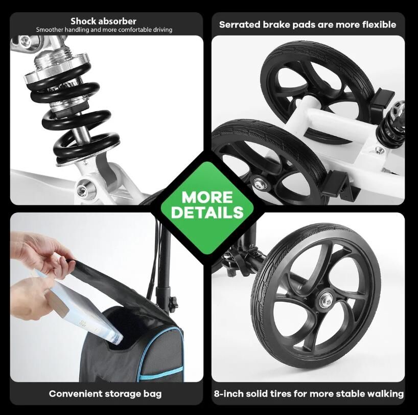 Looking for walking equipment to maintain mobility and independence during recovery? Then you should not miss this knee scooter walker. It is an excellent crutch alternative, ideal for anyone recovering from an injury or surgery to the foot, ankle, or leg. It features a thick, comfy knee pad that supports either the right or left leg. Plus, the knee pad and handlebars are fully adjustable to meet the desired needs of users of different heights. Lightweight yet durable, it is designed with a maximum load capacity of 150kg. The design of four solid rubber wheels, dual rear on-wheel brakes, and an adjustable locking handbrake ensures excellent stability and control when manoeuvring.
