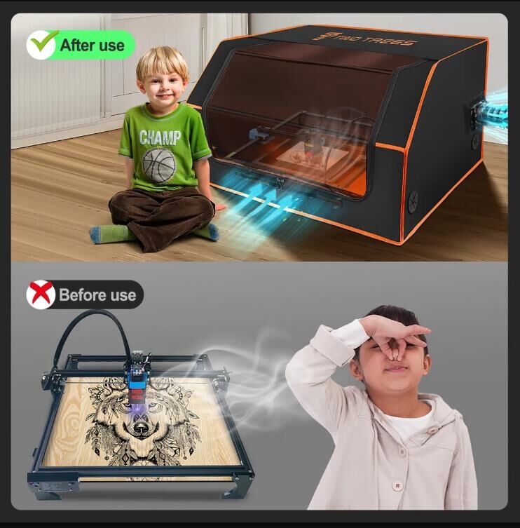- Ultra-high Temperature Fireproof Material: The Laser Engraver Enclosure, made of fiberglass cloth with double-sided silicone coating, withstands real fireproof temperatures of 500°, ensuring laser work safety