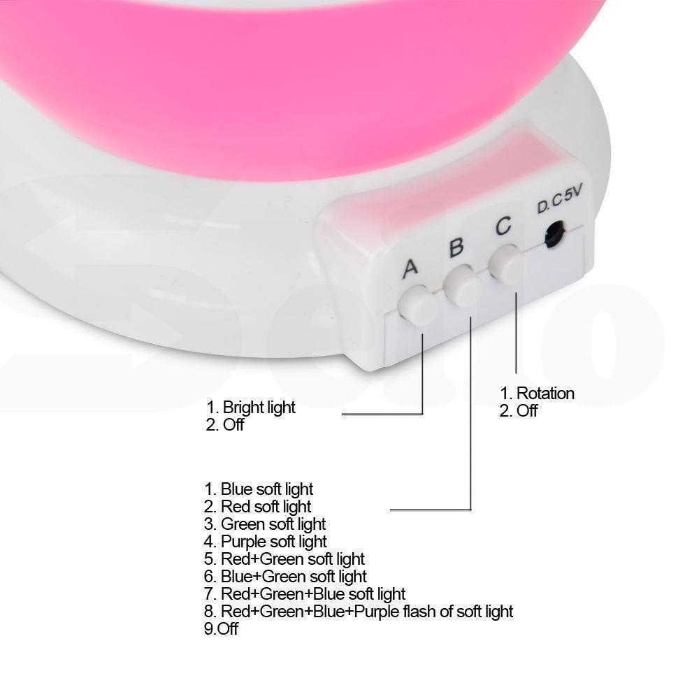 Button C: Allows you to switch on the rotation, which makes the product more fun.