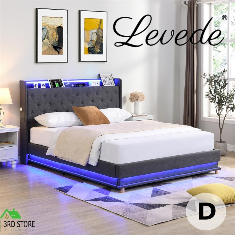 Levede Double Bed Frame LED Light Gas Lift Storage Headboard USB Charging