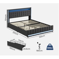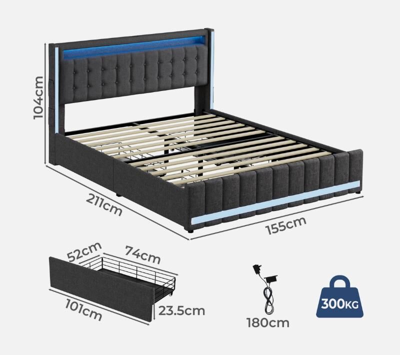 Brand: Levede Frame material: Linen fabric, Steel, Solid wood Slats: Solid wood Slat thickness: 12mm Power: 240V/10A Weight capacity:300kg Fits standard sized mattress: (L x W) Queen: 153x203cm Bed frame dimensions: (L x W x H) Queen: 211cm x 155cm x 104cm Drawers: Queen: 101cm x 52cm x 23.5cm Colour: Grey