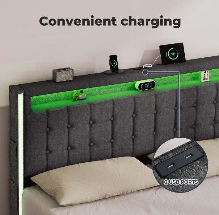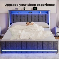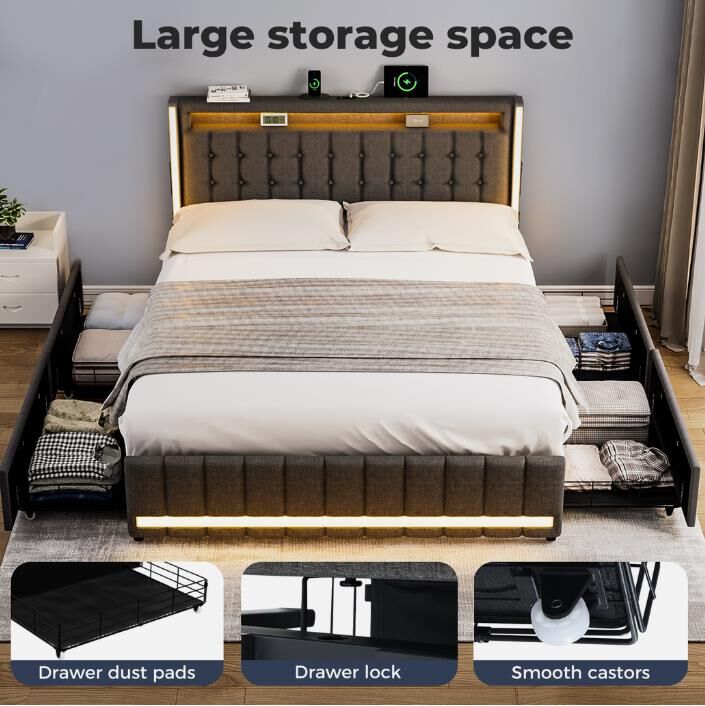 Our bed frame features a high backrest design that provides excellent support for your back and neck, ensuring exceptional comfort during extended sitting or lounging. Relax in style and enhance your bedroom experience. Stay connected with the built-in power outlet and USB ports integrated into the bed frame. Charge your devices effortlessly without extra adapters or cables, keeping your electronics within easy reach. Integrated LED light strips on three sides of the headboard and an aluminum light channel at the foot of the bed enhance the ambiance. The lighting adds a stylish touch and provides practical illumination for a cozy atmosphere. Upholstered in durable gray linen, the bed frame adds a modern touch to your decor while offering long-lasting durability. The high-quality fabric resists everyday wear and tear for easy maintenance. Designed for strength and stability, the bed frame features robust construction for even weight distribution. Four side drawers with dustproof liners offer ample storage for off-season clothing and essentials, keeping your bedroom organized and clutter-free.