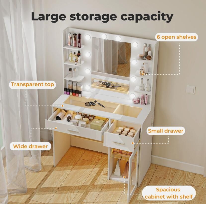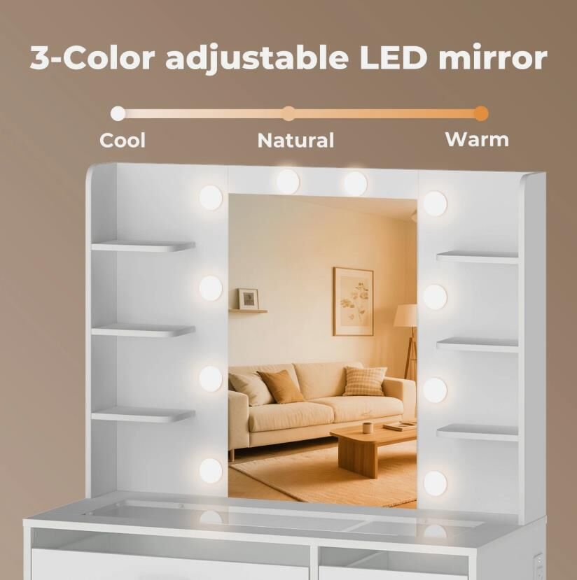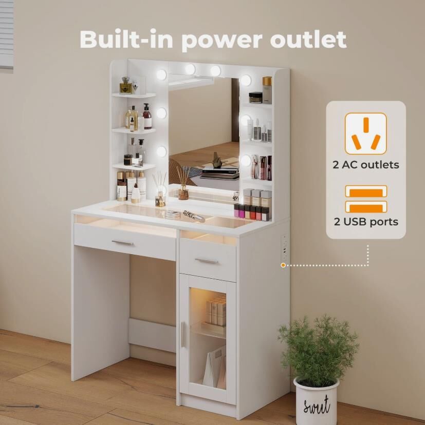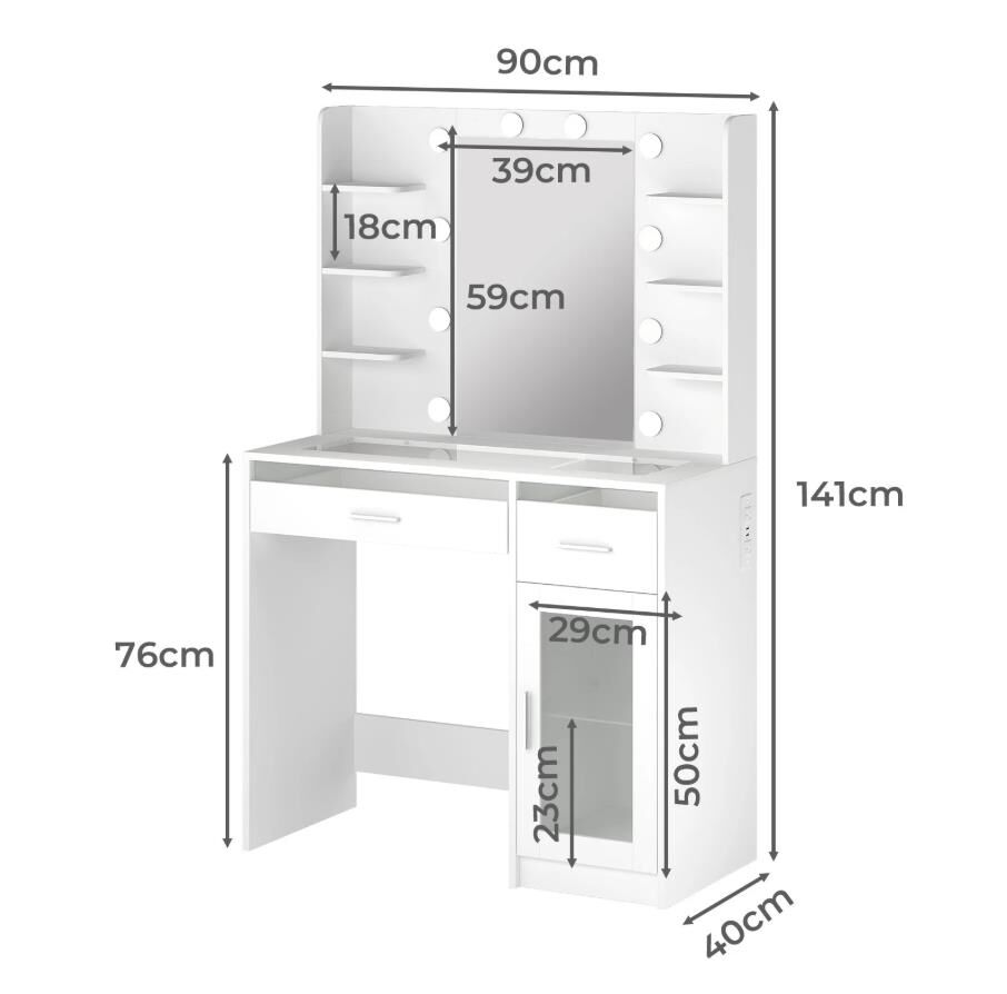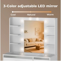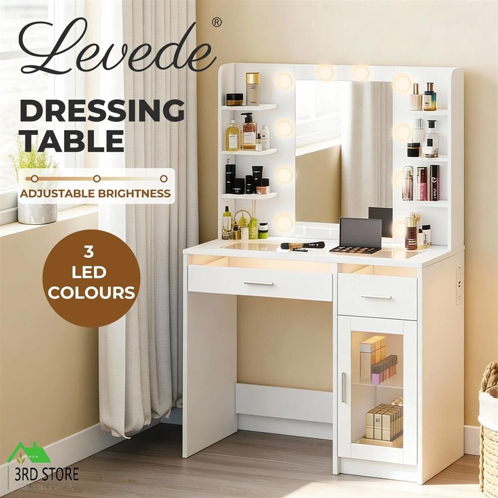Elevate your daily beauty routine with the Levede vanity table, a stylish and functional solution designed for modern living. This vanity table seamlessly combines smart storage and elegant lighting, making it an ideal dressing table for bedrooms or dressing rooms. Featuring a spacious layout, this makeup table includes multiple open shelves, drawers, and a cabinet, creating a true vanity with storage that keeps cosmetics, skincare, and accessories neatly organised.