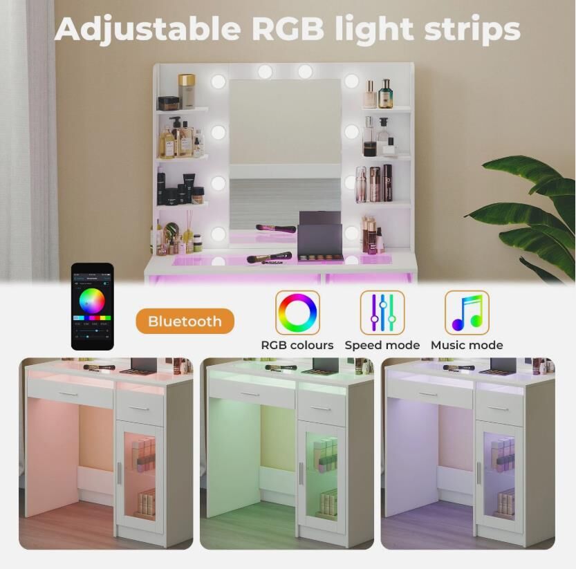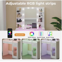 The integrated LED vanity mirror is equipped with Hollywood-style bulbs and supports adjustable lighting modes, functioning as an adjustable brightness mirror suitable for daytime makeup, evening looks, or skincare routines. A built-in colour-changing LED light strip enhances the overall ambience, transforming the unit into a premium LED light makeup desk. With its clean lines and white finish, this white dressing table reflects the refined aesthetic expected from a modern vanity desk.