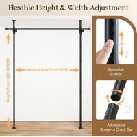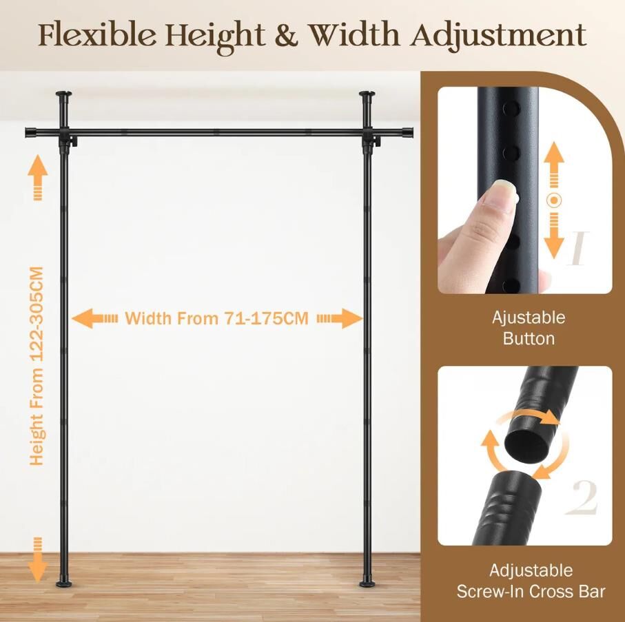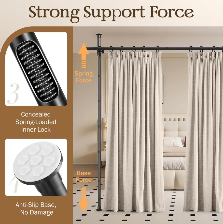 Increase privacy and functionality in open-plan living or working spaces with this Freestanding Room Divider Tension Curtain Rod. Perfect for rental homes, apartments, dorms, and other hard-to-install areas, it offers a simple solution for creating private or separated spaces. The divider adjusts in height from 122 to 305 cm and in width from 71 to 175 cm, making it suitable for a wide range of room sizes. Manufactured from durable, sturdy materials with a spring-loaded inner lock, this extendable curtain rod supports all curtain types, including heavy blockout curtains, light tulle, rod pocket, and buckled top designs. Moreover, the non-slip base ensures secure stability while protecting any surface-whether tile, wood, plaster, popcorn, or textured ceilings-from damage. Designed for versatility, this floor-to-ceiling divider is easy to install, remove, and detach for storage, carrying, or reuse. Whether you need to divide a room, conceal storage, or create a private space, it's an ideal solution for living rooms, dorms, shared apartments, studios, offices, and basements.