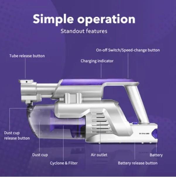 - Equipped with a 2-in-1 slot suction nozzle, wall-mounted holder and charger.