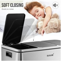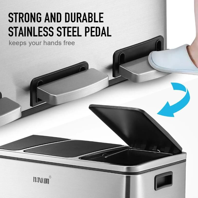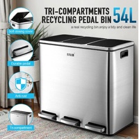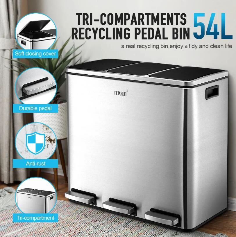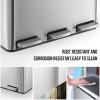 Make your domestic refuse collection and disposal a breeze with Maxkon 54L Three Compartment Pedal Recycling Bin Kitchen Waste Rubbish Bin. The robust stainless steel construction in style ensures that the garbage bin is anti-fingerprint, rust-resistant, waterproof and easy to clean. Humanised designs of a flip-top lid and strong foot pedals allow for good sealing, ultra-silence and hand-free opening or closing. Three separate compartments with a total of 54 litres capacity provide roomy space and sorting possibilities for your recycling. In addition, the trash bin with impressive convenience and functionality matches perfectly with your home decor.