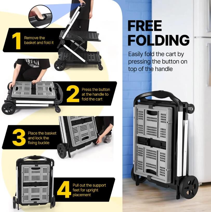 - Lightweight & Foldable Hand Truck: Features two large rear rubber wheels for stability and quiet operation and two front wheels with a 360° swivel function that offer smooth, noise-free movement and maximum stability across various terrains.