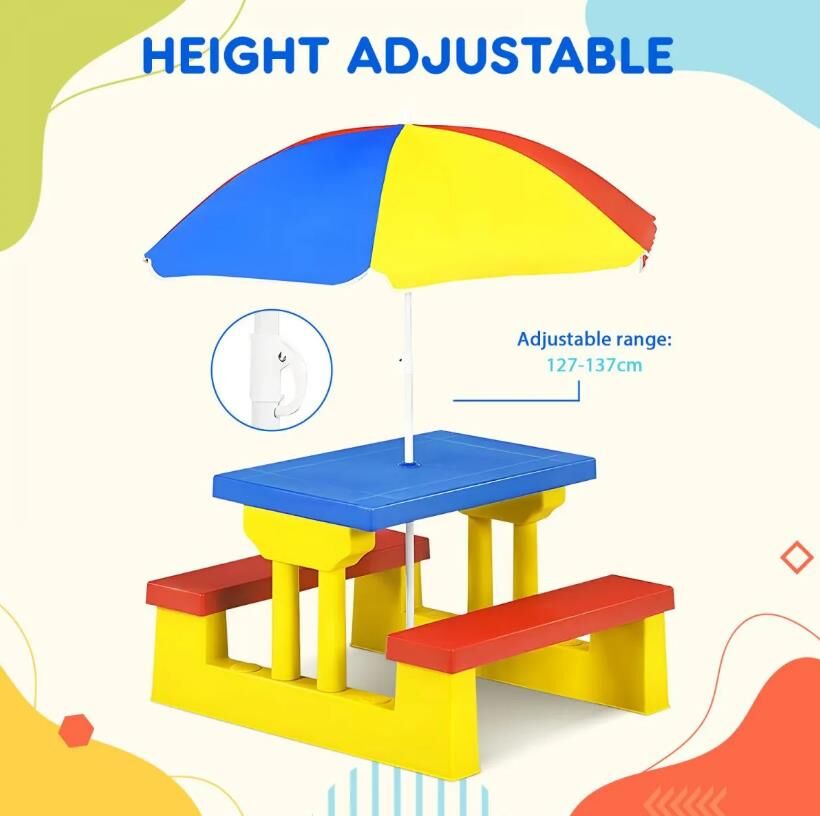 Your little one will indulge in hours of fun in the playroom or outdoor space by using this Kids’ Table and Chair Set. Crafted using sturdy and child-friendly plastic, our toddler table and chairs are non-toxic and safe for children to use. Although lightweight, it is durable enough to withstand years of tough use. Plus, its round edges and corners help keep kids safe while they play. Featuring a two-bench design, our children’s furniture is spacious enough to seat four children, allowing them to do crafts or play games together comfortably. Protect your children from sun rays or rain with a built-in umbrella that is removable and height-adjustable. Even better, our children’s activity table set comes in vibrant rainbow colours, making it more appealing for your younger kids. It boasts flexible portability and easy setup and takedown for picnics, games, and more.