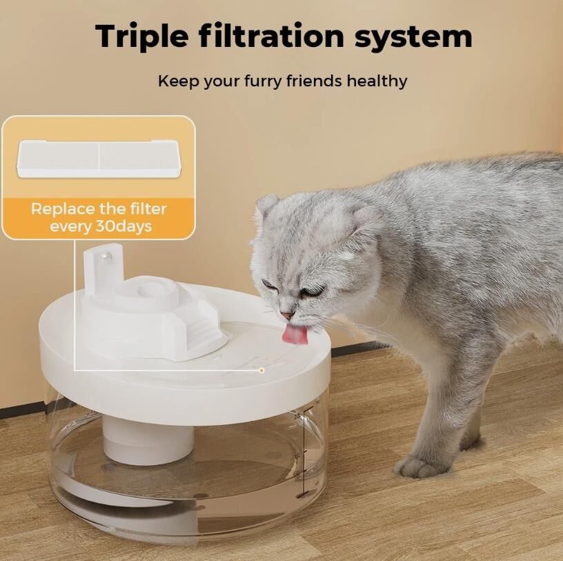 The water pump is equipped with an anti-dry-burn function that prevents damage in case of low water levels. The transparent water tank allows you to easily monitor the water level, ensuring your pet never goes without a drink. The 2.2L capacity provides plenty of water for extended periods, reducing the need for frequent refills.