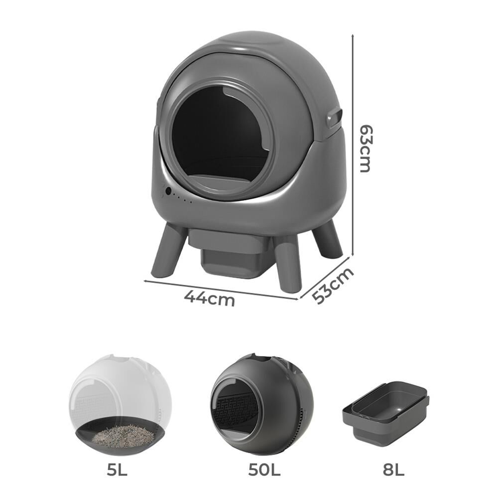 Brand: PaWz Material: ABS Rated power: 9.6W Operating voltage: 12V Internal capacity: 50L Litter box capacity: 5L Waste storage capacity: 8L WIFI connect:2.4G Entrance height: 25cm Dimensions (L x W x H): 44cm x 53cm x 63cm Colour: Grey