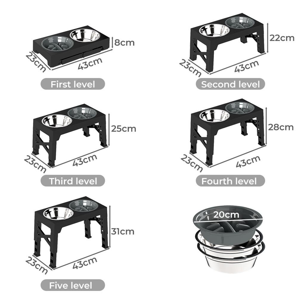 The Pawz Elevated Dog Bowl features 5 adjustable heights (8cm to 31cm) to suit small, medium, and large pets. It reduces strain on joints and encourages better posture, making it perfect for senior and large breed dogs. The included slow-feeding bowl helps prevent bloating, acid reflux, and obesity by slowing down your pet's eating pace.