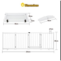 Compared with a dog kennel, a pet safety gate that works as an enclosure keeps your dogs confined temporarily while giving them more freedom to roam. This freestanding dog gate features a foldable structure with 360-degree hinges for easy storage and transportation. With this doorway barrier, you can keep your dogs in the living room at night or keep them downstairs in the daytime. Thanks to the anti-scratch rubber feet, the security pet gate will not damage your floor. For easy access, the dog fence comes with a walk-through door and a one-handed simple lock. Gloss finished, the dog gate for stairs is stain-resistant and easy to clean. Sturdy wood construction ensures a long service life. And two supporting bases offer additional stability.