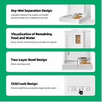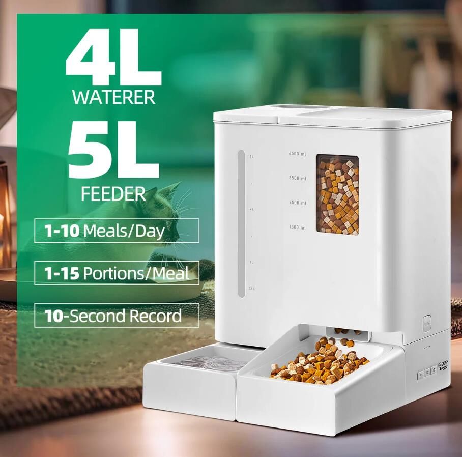 Never let your pets miss a meal! Feed them on time with this high-end automatic pet food and water dispenser. This automatic cat feeder comes with a 5L water dispenser and a 4L food dispenser that works with dry food at diameters of 3-10mm. Also, you can pre-programme up to 10 meals a day and 15 portions per meal, ensuring a consistent and nutritious feeding plan for your furry friends. Besides, you can record a 10-second audio to play at mealtime, helping to establish good eating habits and build a stronger bond with your pet. Additional functions like convenient settings and removable parts offer pet owners an incredible level of control and provide pets with a clean and healthy living environment.