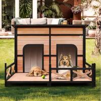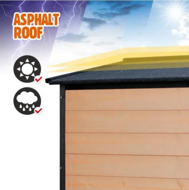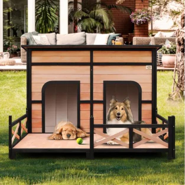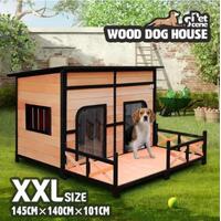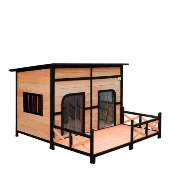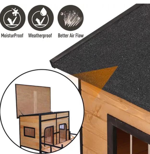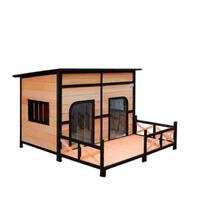 Are you looking for a luxury kennel for your furry friends? This will be your last stop! Because here you will find the best dog house, which is comfortable, spacious and safe. Our dog kennel features two open doors with plastic curtains for easy access, as well as side windows for excellent ventilation and illumination. The flat roof is covered with asphalt to against extreme weathers such as rain and sunlight, and if you expect easy cleaning, it can be lifted as you want. Besides, our wooden kennel is sure to have a longer service life as it comes with feet wrapped by waterproof rubber covers, which lift the house higher for moisture protection. There is a patio included for extra fun, also separable depending on your needs. If you expect premium quality from our outdoor dog kennel which is made of high-quality natural fir wood, it is the top choice for you. Check it up right now!
