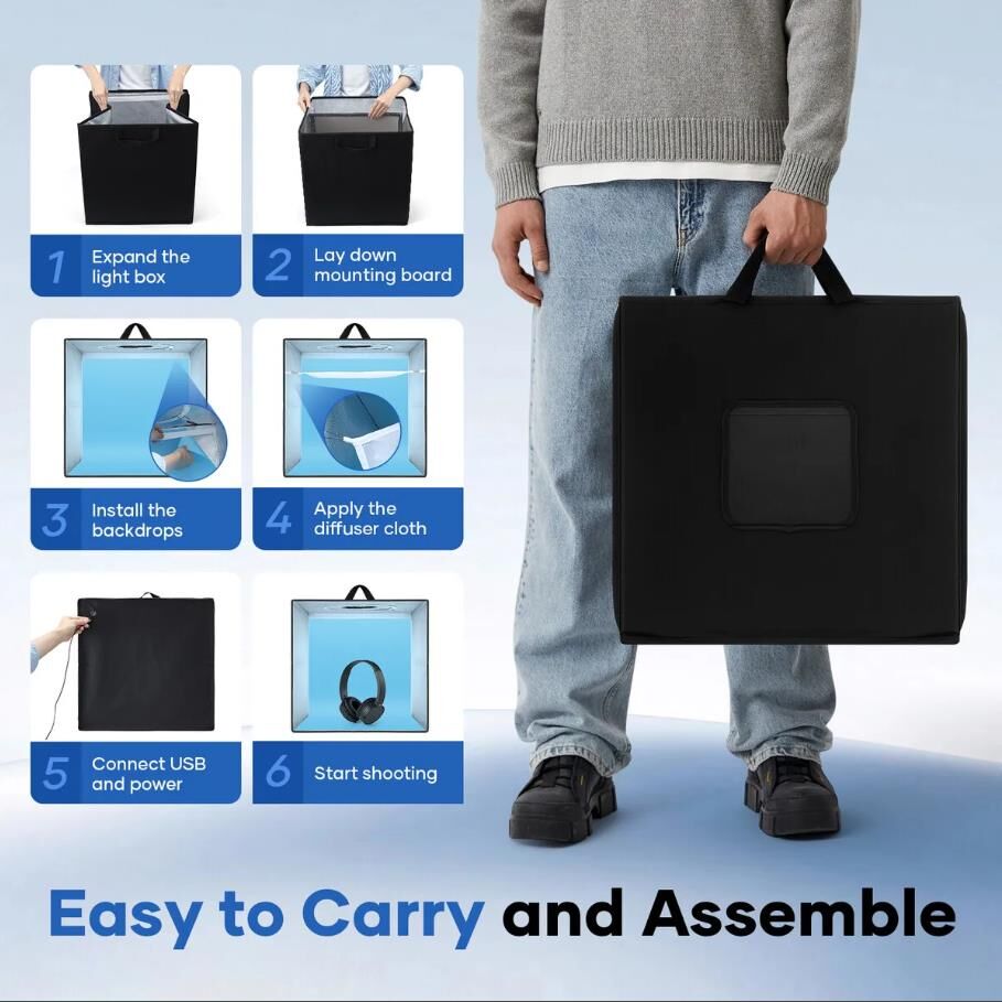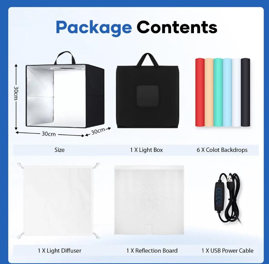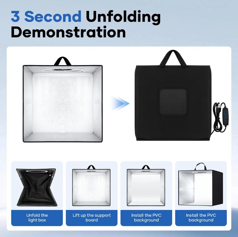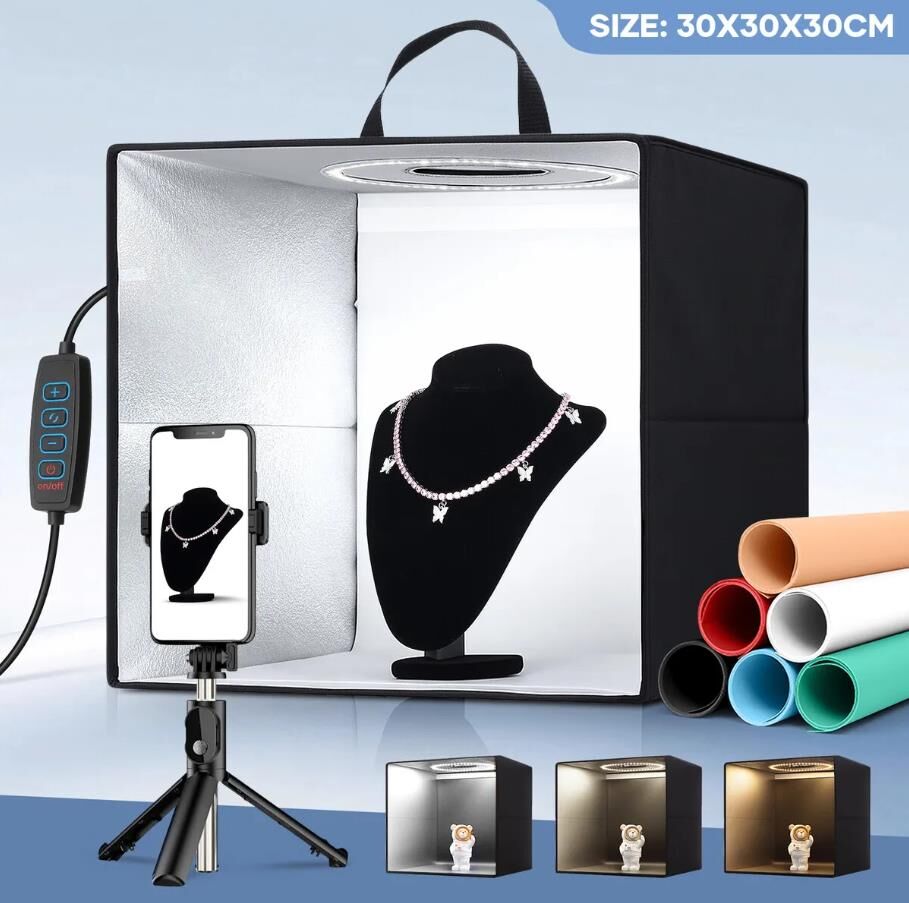 - Compact for Small Items: This mini studio (30x30x30cm) is perfect for jewellery, watches, and other small items. Its size allows full light coverage, and a top opening offers flexible shooting angles.