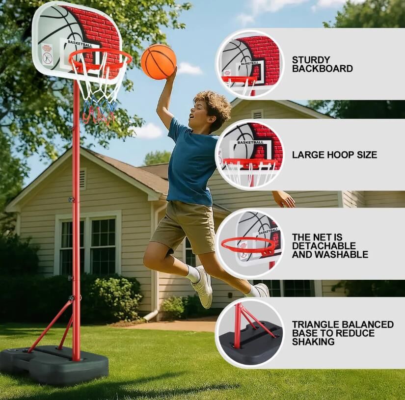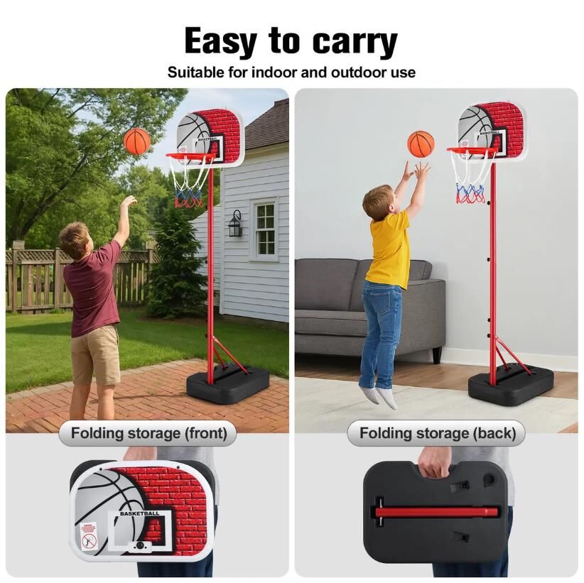 Everyone, especially youngsters who love playing basketball, is eager to have their own basketball hoop stand system. Playing basketball games not only can promote physical fitness but also improve confidence, cooperation, and the teamwork spirit. With this basketball system, it's possible to start a competitive match anytime with your family members or friends. Its height is adjustable from 1.15 metres to 1.6 metres, perfect for any individuals like kids, juniors, or adults. This basketball hoop system allows you to move to anywhere you want thanks to its lightweight and portable design. Settle this stand indoors or outdoors and practice and improve shooting, dribbling, rebounding, passing, and more basketball skills.