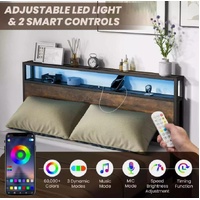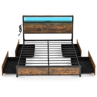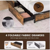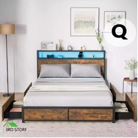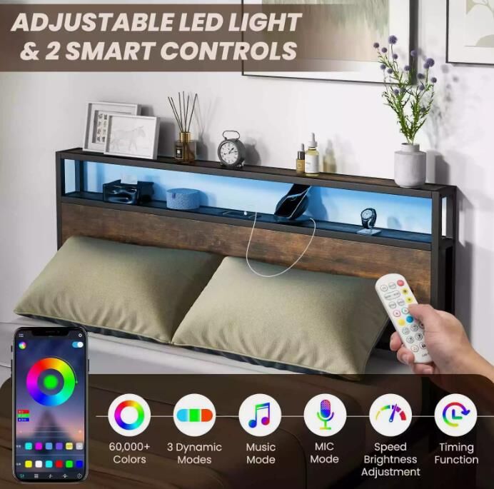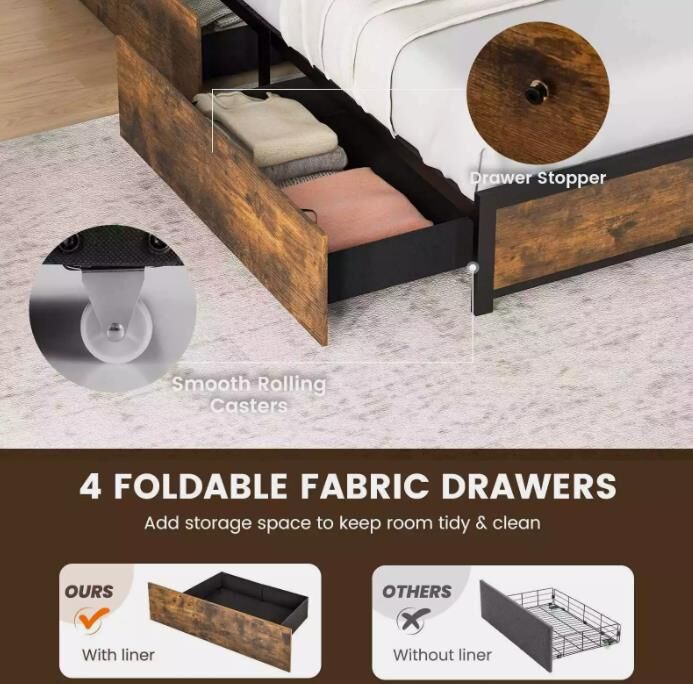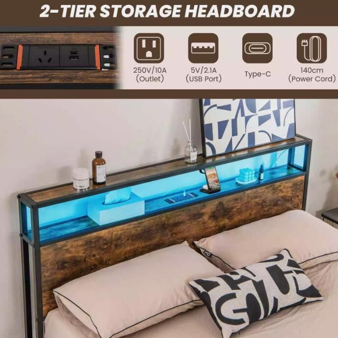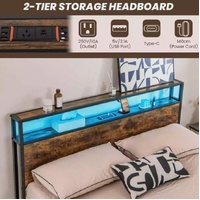 This metal bed frame adjustable LED light & 2 smart controls will upgrade your bedroom! The LED light strip in the headboard features a variety of colors, 3 dynamic modes and music sync function, allowing you to create a magic light show for your own romantic palace. The brightness, flashing speed and timing function can be operated by remote or app control to create various scenes. This 2-tier headboard also features storage shelves to keep bedtime essentials handy and built-in charging station to charge multiple devices. More importantly, the platform bed is crafted with a metal slatted frame for solid support and long-term durability. There are more user-friendly features, 4 fabric drawers on casters can roll in and out smoothly, providing ample storage space for a variety of items. All in all, the industrial LED bed frame makes up a high-quality and understated appearance.