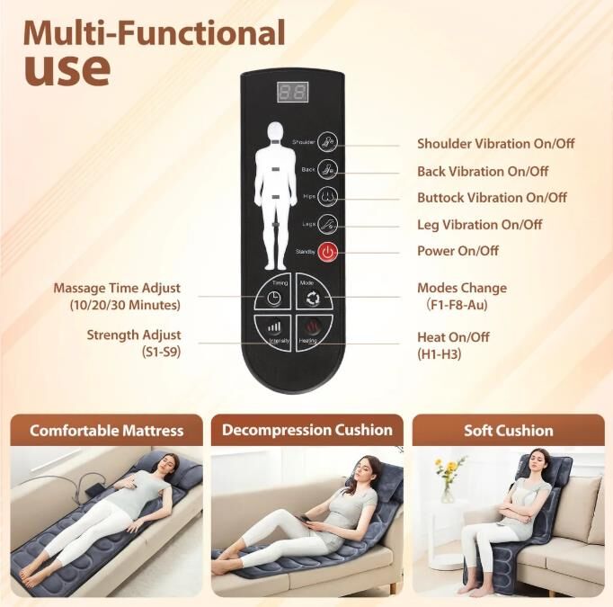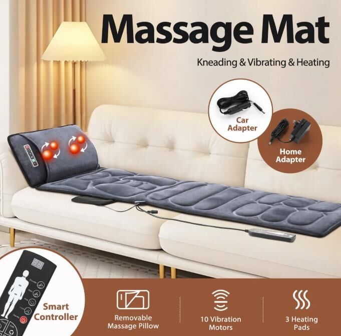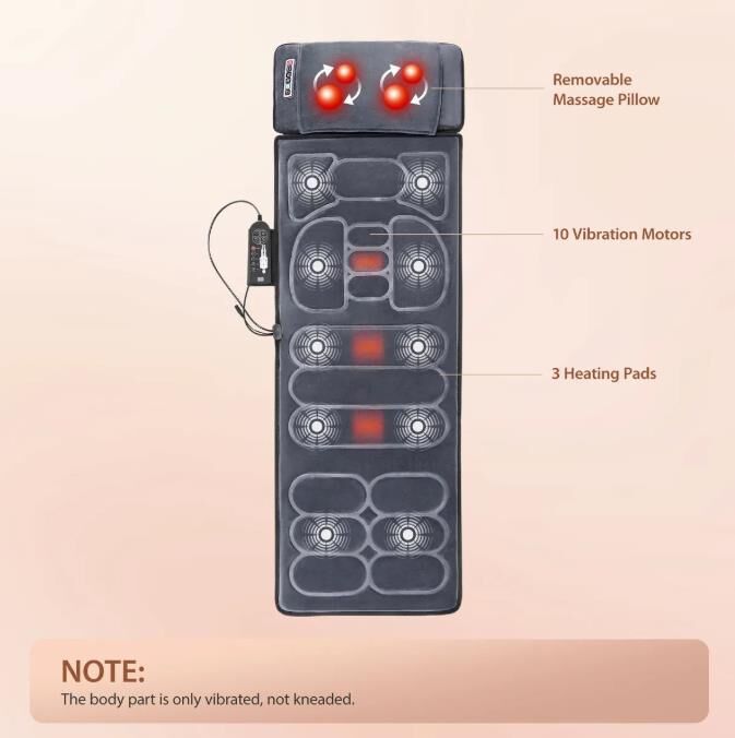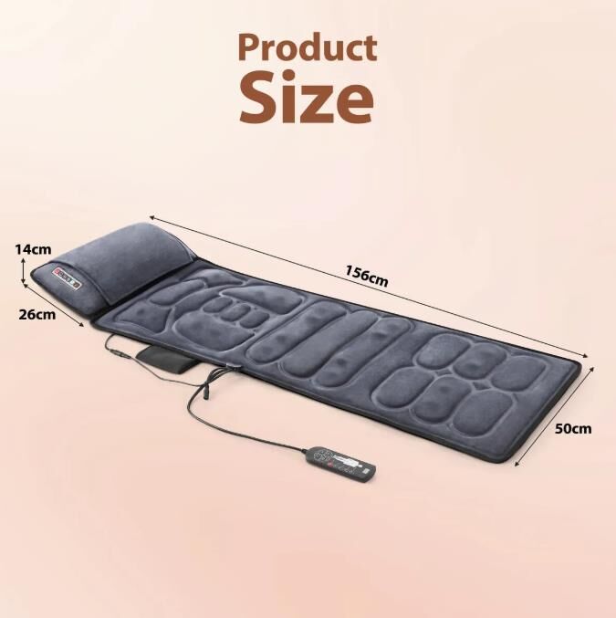 Embrace the luxury of professional-grade massage at home with this heated vibration massage mat full body electric heating pad. Boasting vibration and heating functions, this massage pad offers a full body massage, extending to your neck, shoulders, back, buttocks and legs. Moreover, the shiatsu massage balls specially target your neck with deep, kneading massages. In addition, three integrated heating pads ensure consistent warmth for optimal comfort and relaxation. The easy-to-use hand controller lets you effortlessly cycle through settings to find your perfect massage. Ideal for various locations, this electric heating pad can be enjoyed on the bed, couch, recliner, chair, floor or car seat. Besides, its foldable design allows for easy storage and transport, making it perfect for both home and car use.