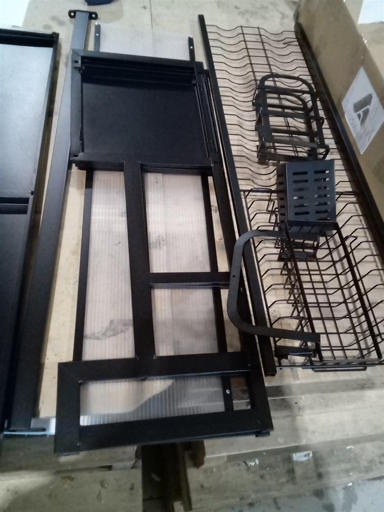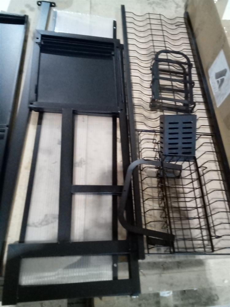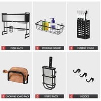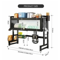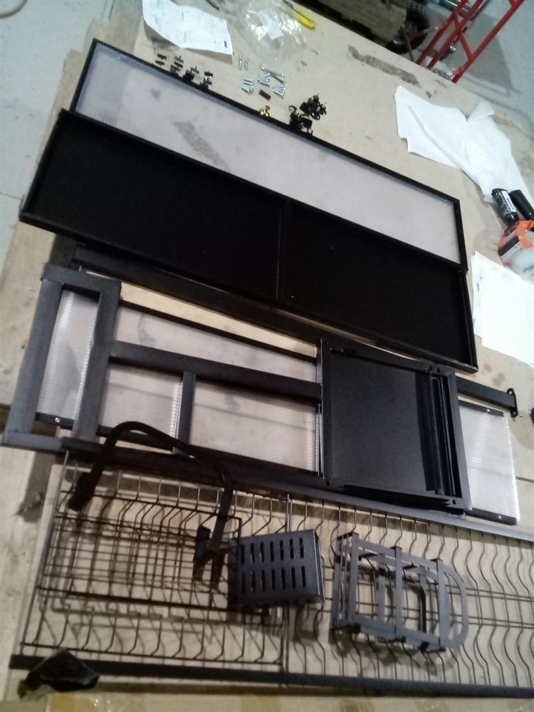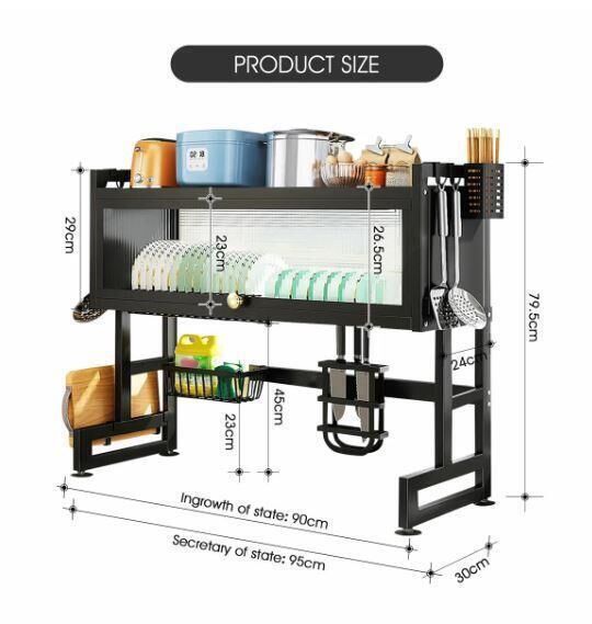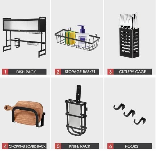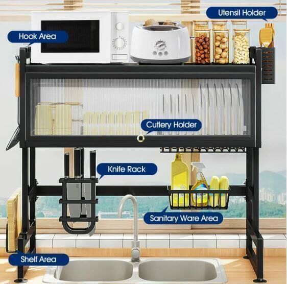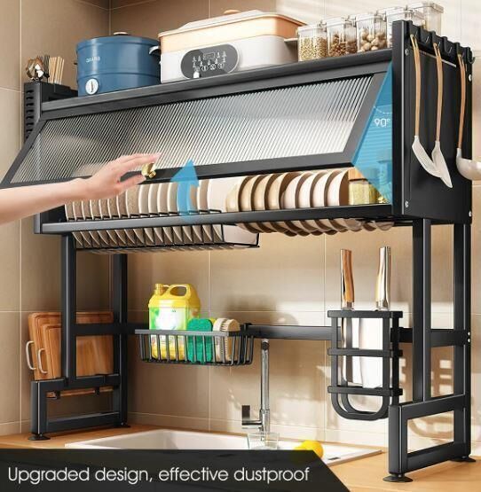 The product is a versatile dish drying rack that can be used over the sink or on the counter, maximising your kitchen space and saving you time. Its convenient flip-up door design keeps your sink hygienic and dust-proof, while the light and luxurious handle makes it easy to open. Moreover, its superior quality advanced carbon steel guarantees the rack is durable, easy to clean, and rust-proof. What's more, you can assemble it easily with the included step-by-step instructions. The functional and thoughtful design allows for adjustable and removable parts, including a dish rack, bowl rack, knife holder, storage basket, chopping board, cutlery holders or chopstick cages, and hooks. You can design your own style.