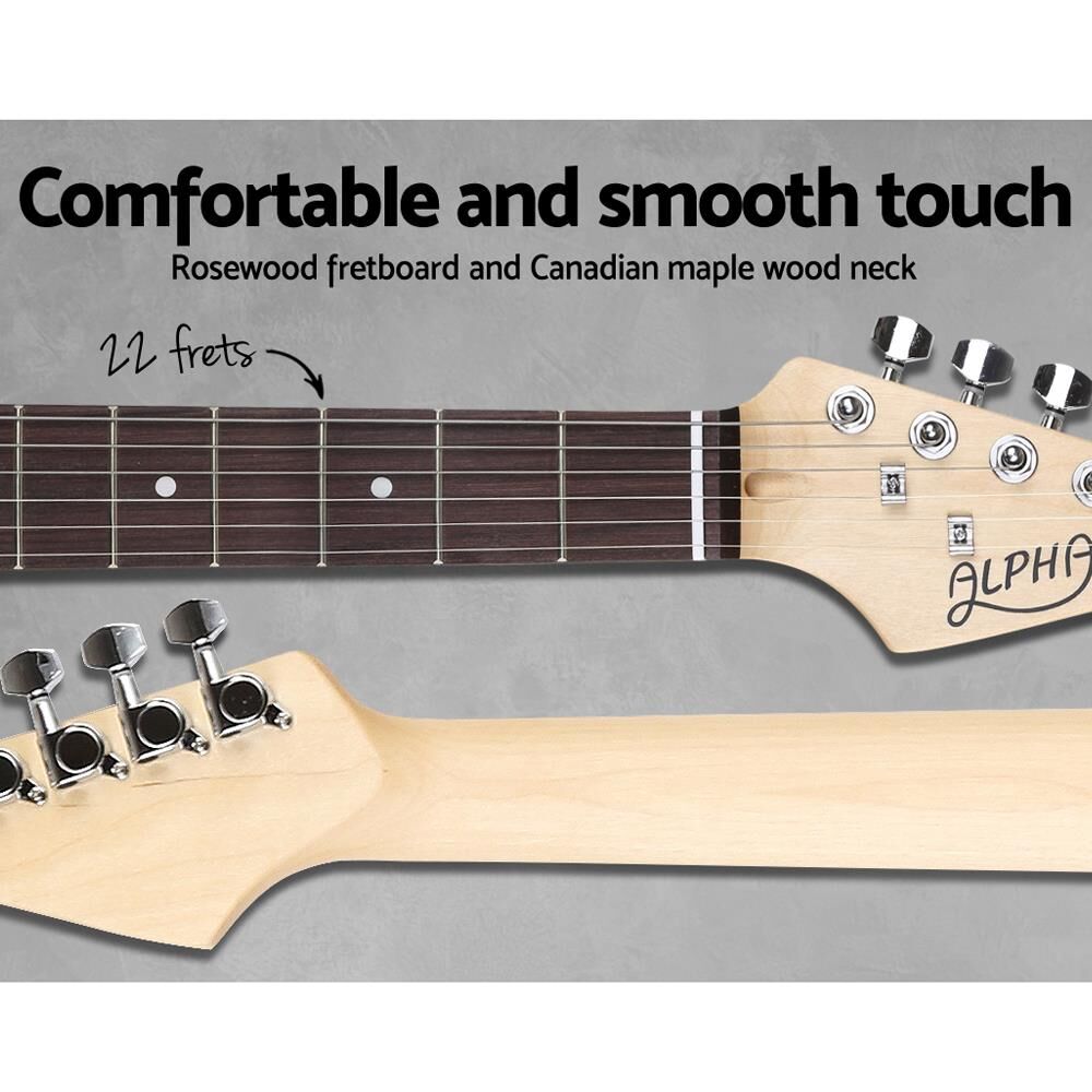 Often emulated for its classic shape and superb tones, the Stratocaster has been the definitive electric guitar for more than 60 years. And our Alpha Strat-style Electirc Guitar aims to help you fulfill your passion of playing this iconic legend at a very affordable price. Great for beginners, the Alpha Electric Guitar comprises a comfortable and glossy Poplar body with a high quality wooden neck and fretboard. The neck is smooth and the 22 frets are designed to enable you to play with ease. Not least, the 3-way pickup switch allows you to select your favourite tones from the warm timbre of the open coil humbucker pickups. In short, this versatile guitar will suit any genre of music, from rock, pop, blues, to funk, country and more. Also included with the electric guitar is a snazzy whammy bar for the tremolo bridge, cable, guitar bag and other useful accessories.
