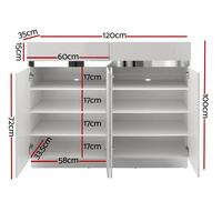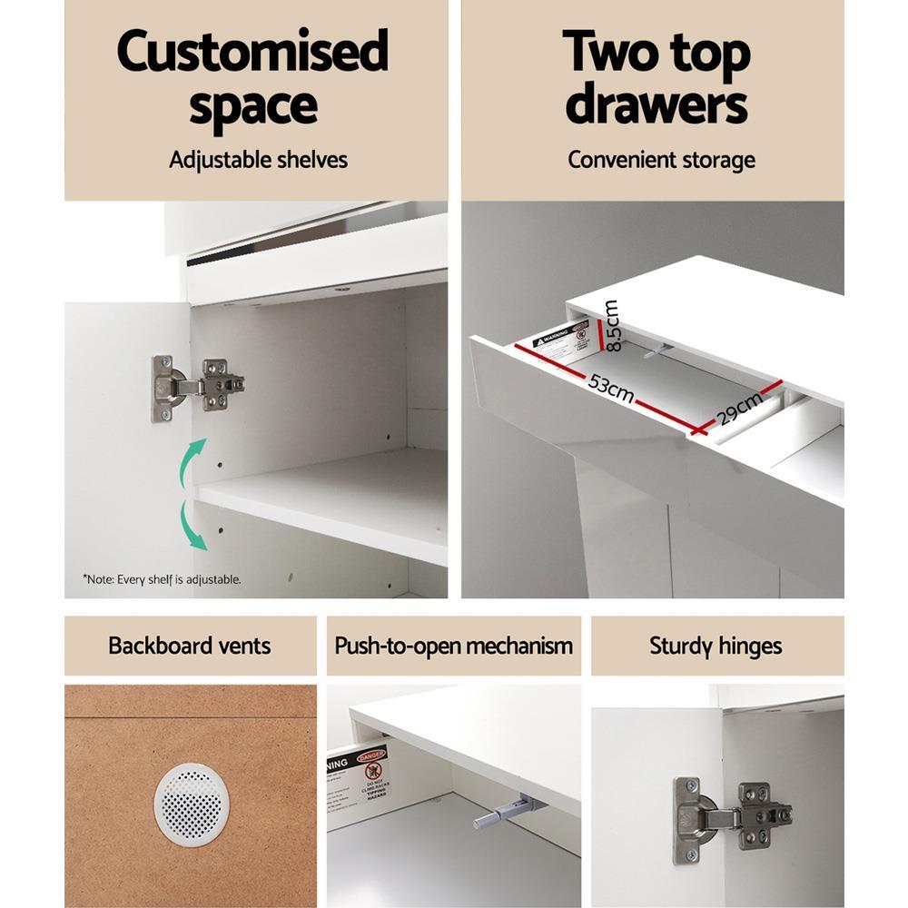 Specifications: Brand: Artiss Frame material: 12mm Particle board Back board: MDF Front finish: UV high gloss Frame finish: Melamine Overall dimensions: 120cm x 35cm x 100cm Colour: White Assembly required: Yes Number of packages: 2