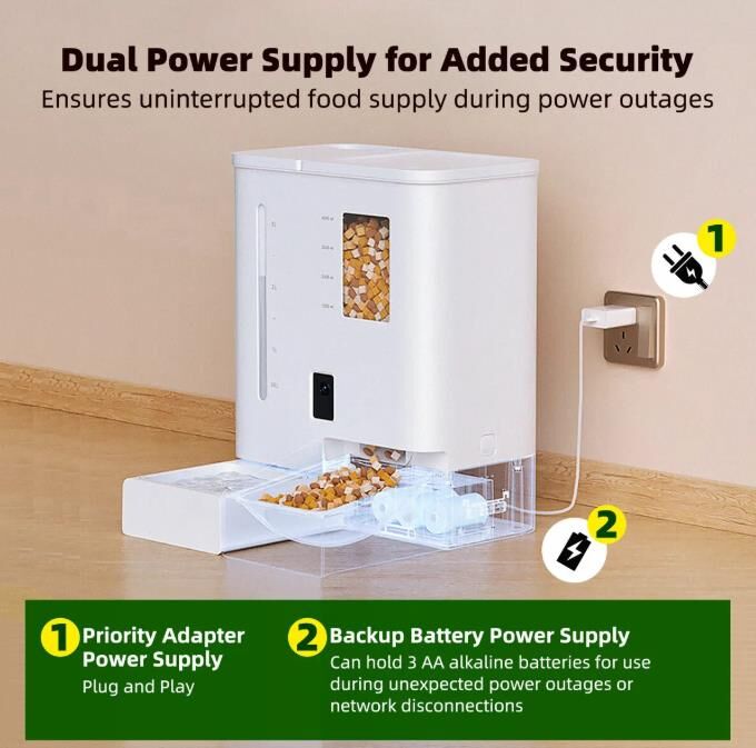 - Wired or Battery Power: Choose between a fixed wired connection with the 5V adapter USB power cable or a portable 3 AA alkaline battery-powered feeding station. These flexible options ensure your pet won't go hungry during power outages.