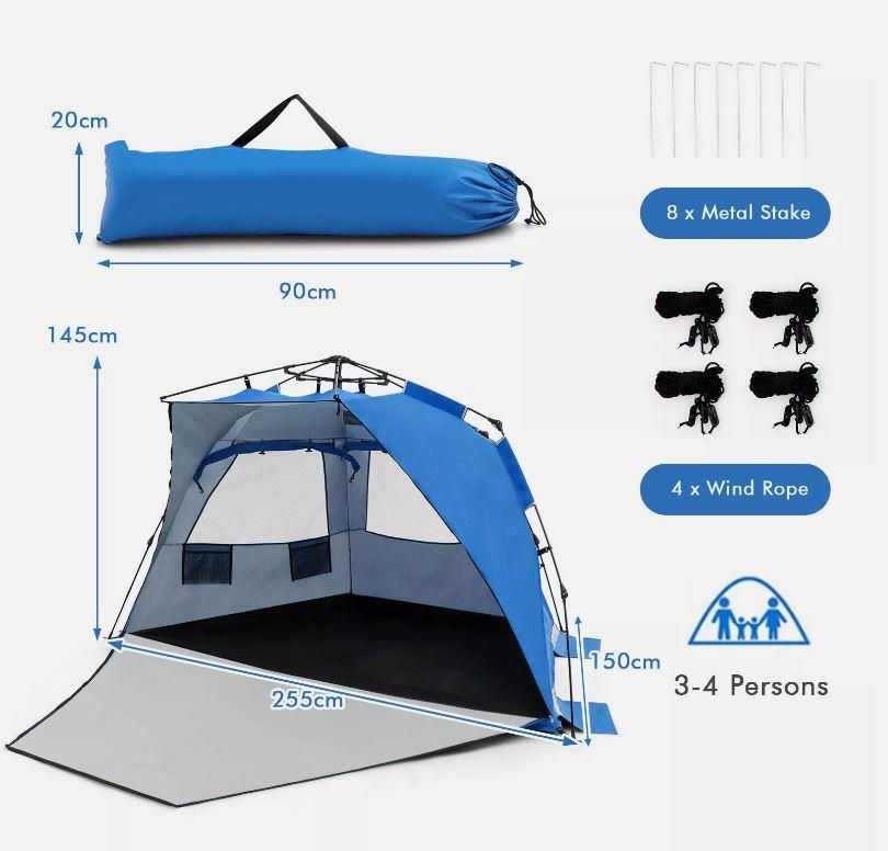 Roomy Space and Private Design: The portable beach tent measures 240 x 140 x 145 cm (L x W x H), providing a spacious interior shelter, which can accommodate 3-4 persons. Moreover, there exists an extended floor to expand the activity space. And the front porch can be zipped up, so the tent would be a private beach cabana.