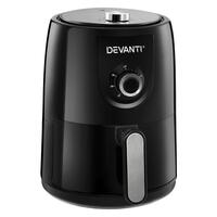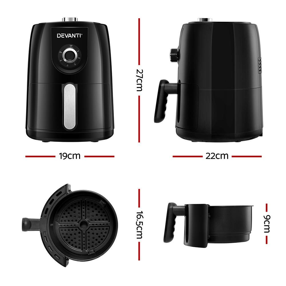 Specifications: Brand: Devanti Power: 1200W Control type: Knob control Fryer basket capacity: 1.8L Temperature range: 80°C-200°C Timer: 0-30 minutes Cable length: 102cm Basket diameter: 16.5cm Overall dimensions: 22cm x 27cm x 19cm Colour: Black