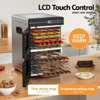 Achieve professional-quality food preservation with Devanti 's premium dehydrator. The dual-zone stainless steel design ensures efficient drying across 12 food-grade trays, while the LED panel lets you precisely control temperatures (35°C–80°C) and timers (up to 48hrs). Monitor progress through the transparent glass door with interior lighting, perfect for fruits, meats, herbs, and jerky. Includes bonus fruit roll sheets and mesh trays for delicate items. Safety features like overheating protection, heat-shielded vents, and anti-slip feet ensure worry-free operation. Commercial-grade construction meets easy cleaning – all trays and accessories are dishwasher-safe..
