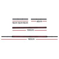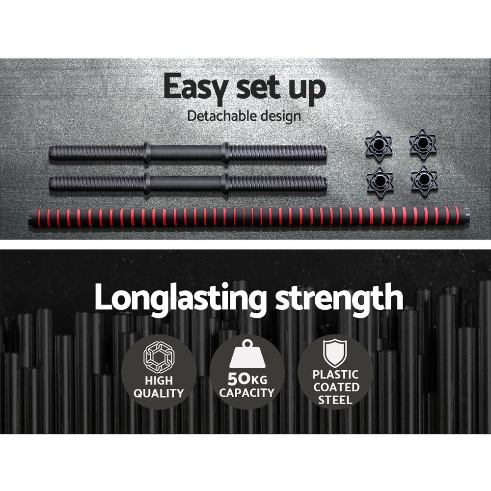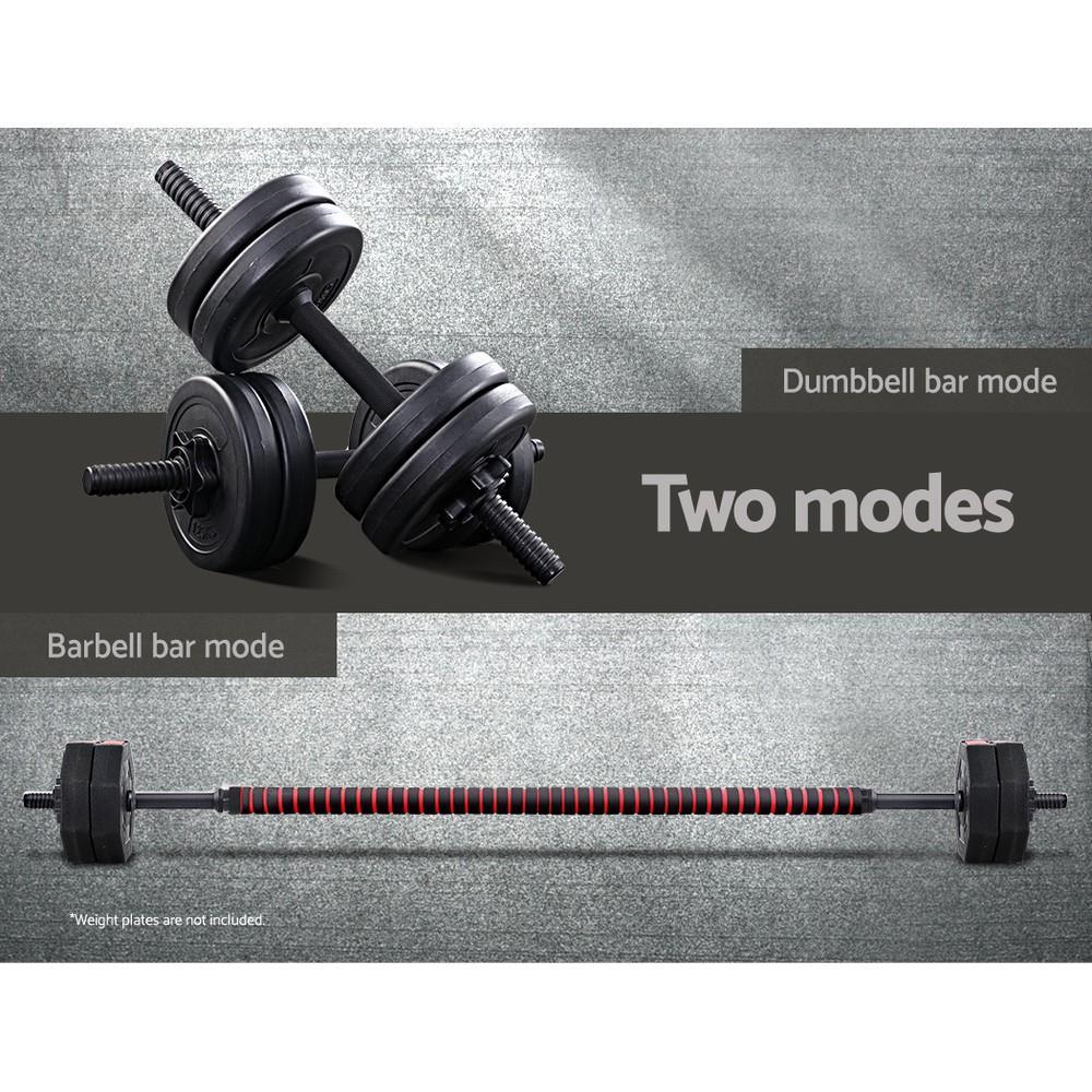 Specifications: Material: Steel coated in plastic + foam Weight: 2.55kg Barbell mode Length: 160cm Dumbbell mode length: 45cm Diameter: 25mm Weight capacity: 50kg Assembly required: Yes Number of packages: 1