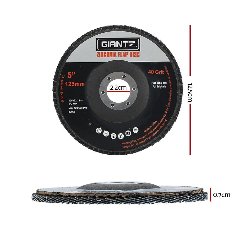 Quality DIY builds require quality tools, and you can't go wrong with Giantz 5" Flap Discs. Made from high-quality zirconium oxide, these discs are ultra-tough and ideal for all your cutting needs. Featuring a fibre netting backing, the discs are vibration resistant and have good heat dissipation, while the stainless-steel centre ring allows for safer installation and clamp strength. With extremely low vibrations and a max speed of 12500rpm, this disc makes a clean and stable cut every time. Suitable for wood and a variety of metals including stainless steel, aluminium and cast iron. Specially formulated for angle grinders and at EN-certified quality, these Giantz Flap Discs will last the life of your project and beyond. Comes in a pack of 20.