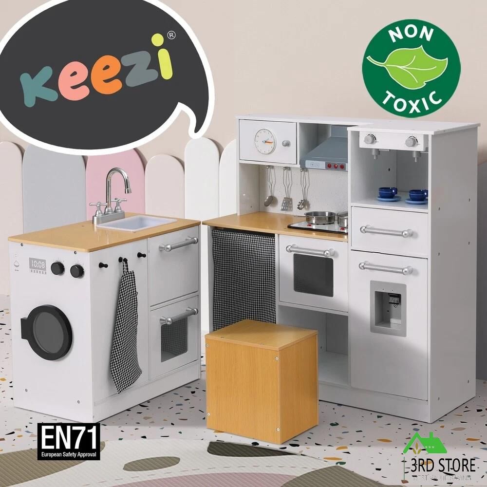 Introducing our Keezi Kids Wooden Kitchen Playset: features a sturdy MDF and solid wood construction, smooth easy-clean surfaces, ample storage, and simple assembly with detailed instructions. The perfect gift for young aspiring chefs!