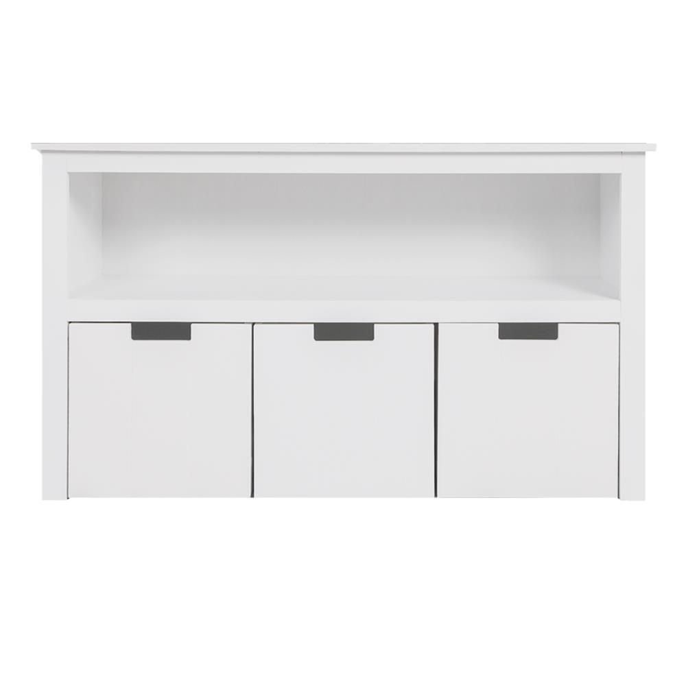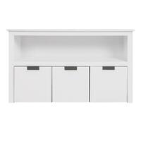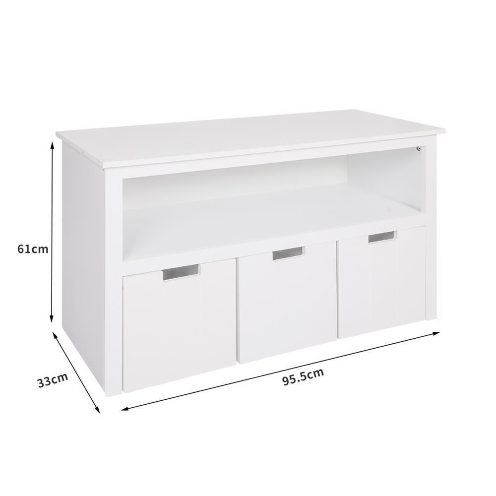 Your playroom storage chest can fit into any room in the house. Living room bedroom kid’s playroom and more. Store toys in the drawers below and books on the shelves.